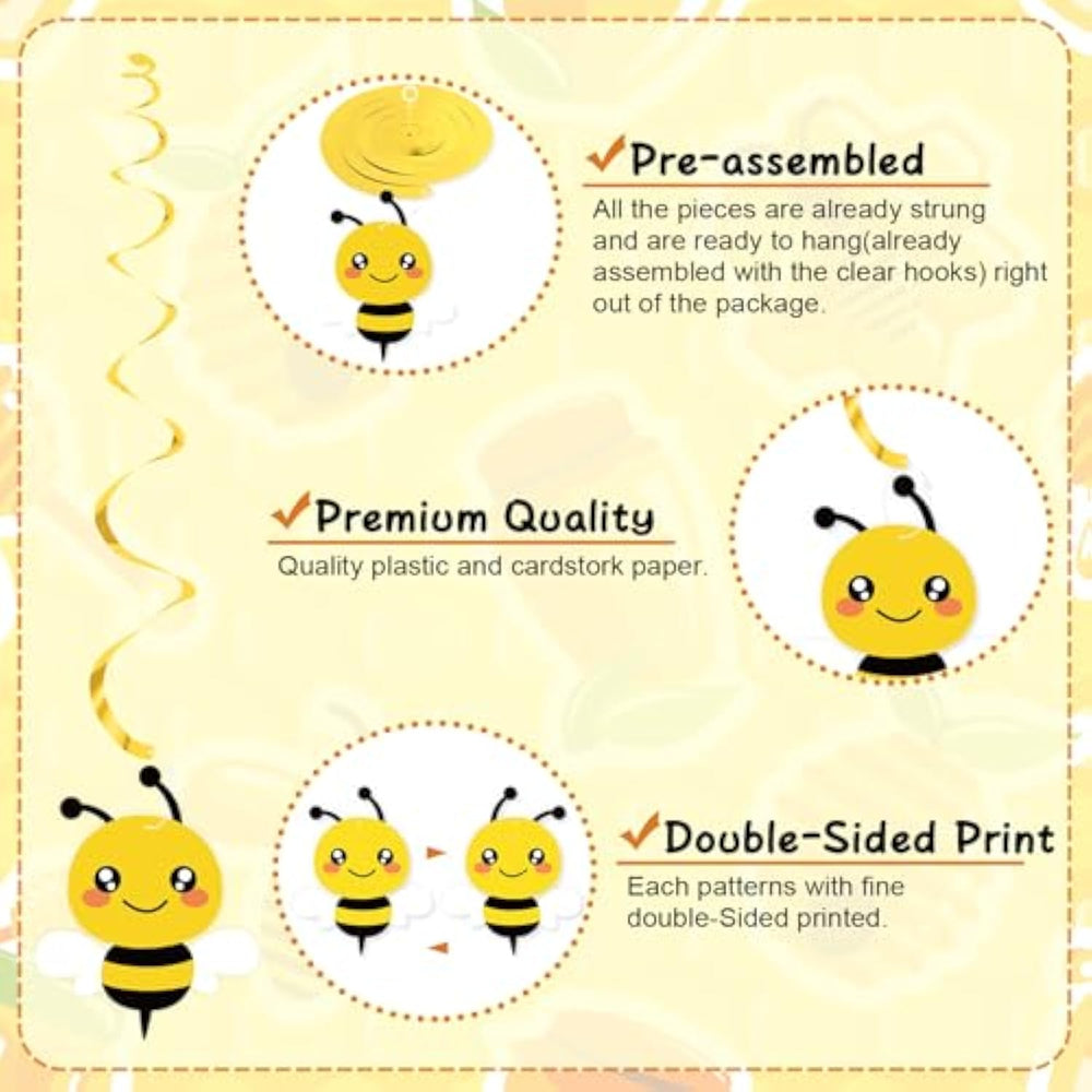 | Adorable Bee Hanging Decorations: Add These Super Cute Bee Hanging Swirl To Your Bee Themed Party; The Honey Bees, Honeycombs, Bee House And Sunflowers With Matching Streamers Adding To This Set, Perfect For Your Happy Bee Day Party Decorations | | Valuable 20 Pack: Come With 20 Pack Set (Including Pre-Strung 20 Pcs Foil Swirls + 20 Pcs Cutout), 4 * Honey Bees, 4 * Honeycombs, 4 * White Flowers, 4 * Sunflowers, 4 * Bee House | | Premium Quality Hand-Crafted: Our Honey Bee Swirls Made Of Quality Foil And Hard Paper Card, Cardstork Paper With Fine Double-Sided Print, Sturdy And Reusable, Fetured With Beautiful Colors, Cute Patterns, Exquisite Craftsmanship | | Pre-Strung And Easy To Hang: No Diy Needed; This Bumblebee Ceiling Streamers Comes With Already Assembrated, Easy To Use, Just Spread Streamers Out And Hang It On The Place You Prefer, Ideal For Indoor Or Outdoor Decorations | | Suitable For All Occasions: This Bumble Bee Swirls Suits For Baby Birthday Party, Baby Shower, Baby Gender Reveal Party Supplies, Bridal Shower, Home Parties, Kids Room Daily Decorations, Bee Day Party Favor, Bee Themed Party Supplies, Etc | |