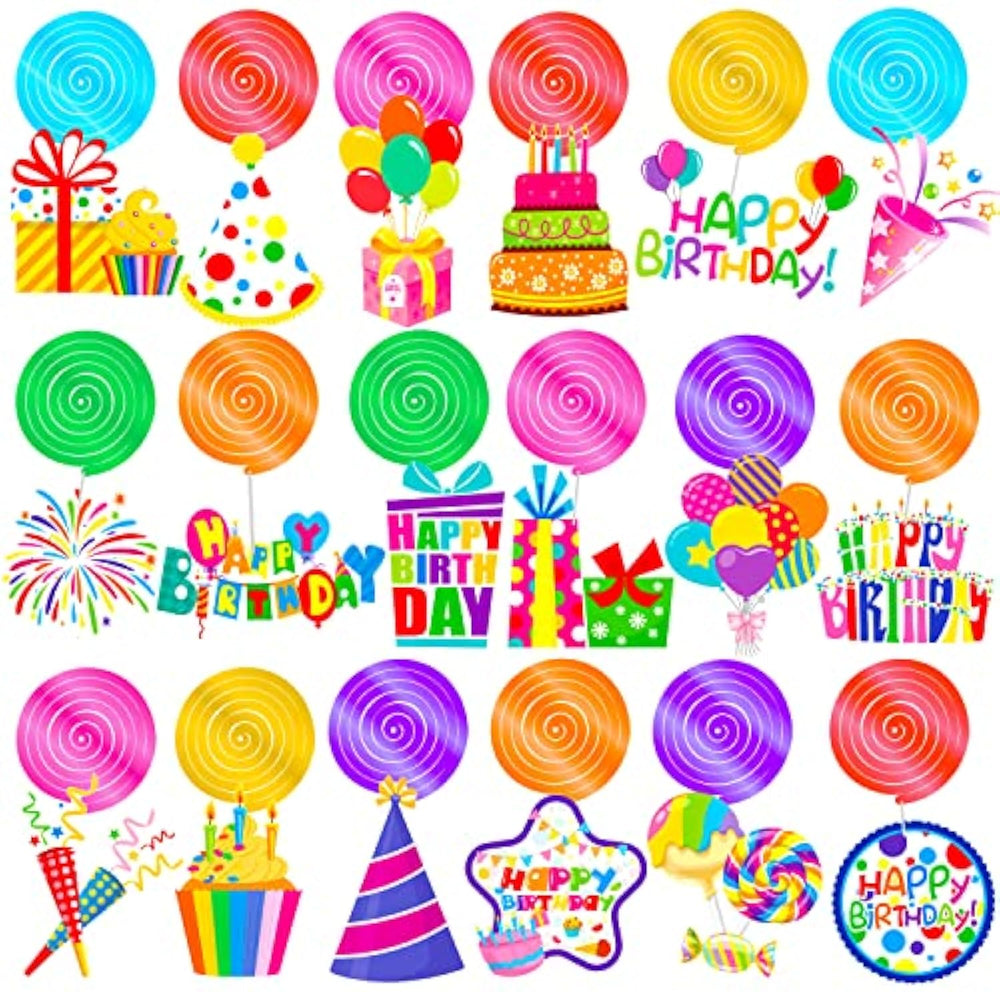 This birthday party hanging swirl set includes 20 colorful decorations featuring 18 unique birthday-themed designs like cakes, balloons, hats, gifts, and candy, plus 2 plain spiral ornaments. Made from durable cardstock, these vibrant rainbow-style swirls are perfect for adding festive flair to any room, whether it's a living room, baby room, or party space. Ideal for birthday parties, baby showers, and other cheerful celebrations, these hanging decorations bring a playful and lively atmosphere to your event.