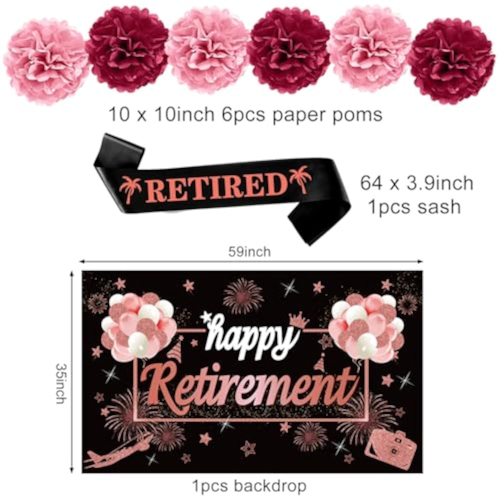 | [You Will Receive] -20Pcs Retention Party Decorations Kit, 1 × Happy Retirement Backdrop, 1 × Happy Retirement Poster, 1 × Rose Gold 'Retirement' Shoulder Strap, 6 × Paper Pompoms, 6 × Double Sided Retirement Handling Swirls, 5 × Honeycomb Centerview?This Set Is Enough To Decorate Your Retirement Celebration Party. | | [Retired Themed Design] - A Happy Retirement Party Decoration Primarily In Rose Gold And Pink. Fun Words Such As "Happy Retirement", "Adventure Begins", And "Cheers To Retirement" Cleverly Match Various Party Element Patterns, Such As Stars, Balloons, Coffee Cups, Cakes, Alarm Clocks, Etc., To Create A Perfect Retirement Themed Party Event For You. | | [Farewell Goodbye Party] - Suite For Farewell Party, Goodbye Party And Recruitment Party For Women. The Poster Set Can Serve As A Party Background, The Honeycomb Center Of The Table Can Be Used To Decorate Your Birthday Table, The Hanging Vortex Can Be Used As Ceiling Decoration, Backdrop Can Be Hung On The Front Door, Balcony, Walls, Windows, Fences, Etc. Additionally, Wear A Retered Sash To Light Up Your Retered Themed Party. Decoration Can Also Be Used As A Background For Birthday Phot. | | [Easy To Assemble] - Our Retirement Themed Set Is Easy To Assemble. Double Sided Cards, Retirement Backdrop, Posters, And Hanging Vortices All Have Pre Cut Holes That You Can Easily String Together For Decoration And Reuse; To Install The Honeycomb, Simply Peel Off The Sticker And Rotate The Base 360 °; Both Adults And Children Can Assemble It, Making It Convenient For You To Enjoy Retirement Parties With Family, Friends, And Colleagues. | | [High Quality Materials] - This Retirement Decoration Is Made Of High-Quality Cards, Metal Foil, And Polyester, Which Is Both Beautiful And Durable. They Are Lightweight, Easy To Hang, Easy To Carry, And Can Be Used For Retirement Celebration Parties. | |