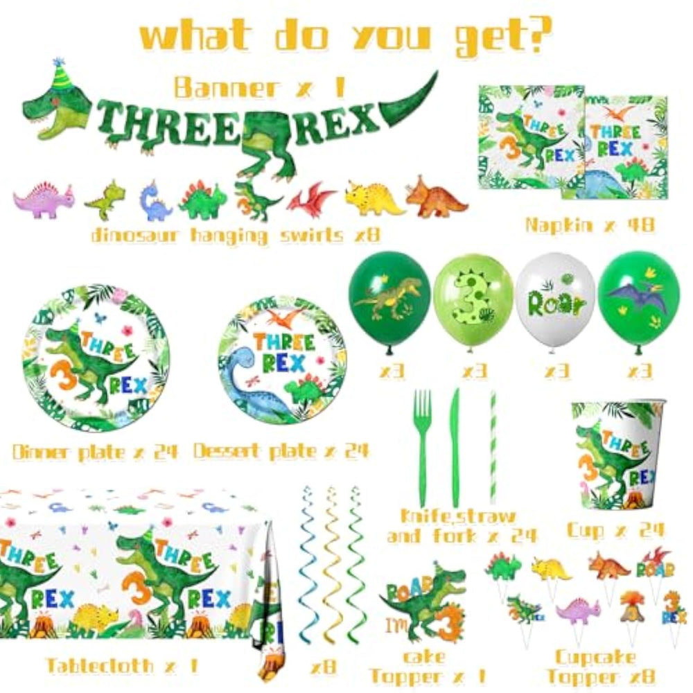 | Dinosaur Party Decorations:1 Dinosaur Birthday Banner+8 Dinosaur Hanging Swirls,24 9-Inch Dinosaur Birthday Plates, 24 7-Inch Dinosaur Kids Plate,24 Dinosaur Party Cups, 24 Dinosaur Napkins,24 Forks,24 Straws,12 Pcs Balloons (4 Styles),24 Pcs Cake Toppers,1 86.61*51.18-Inch Three Rex Dinosaur Table Cloth | | Quality Materials:Our Dinosaur Party Supplies,Including Three Rex Birthday Plates And Napkins Is Crafted From High-Quality Paper That Is Both Reliable And Safe Dinosaur Birthday Decor | | Easy Cleanup:Three Rex Birthday Decorations Make Cleanup A Breeze,Simply Discard The Dinosaur Birthday Table Cloth,Paper Plates,And Napkins After Use.Effortlessly Assemble The Roaring T-Rex Banner,Hang The Playful Dinosaur Swirls.These 3Rd Birthday Decorations For Boys Combine Quick Installation,You Can Easily Create A Dynamic Party Atmosphere For Kids | | Dinosaur 3Rd Birthday Decorations:Ignite Your Boy'S Birthday Party With Our Three T-Rex Birthday Themed Decorations! The Plates And Napkins Feature Cute T-Rex Dinosaurs Wearing Party Hats—Fierce Yet Friendly, Perfect For 3-Year-Old Boys.With Colorful Dinosaur Designs,Dinosaur Party Decorations Create An Immersive Party Experience! | | Multiple Uses:Dinosaur Decorations Plates For Birthday Party For Boys And Girls,3 Rex Birthday Decorations Boys,T-Rex Theme Events,Or Dino-Themed Baby Showers.Dinosaur Birthday Decorations 3 Year Old Boy,And T-Rex Birthday Party Decorations | |