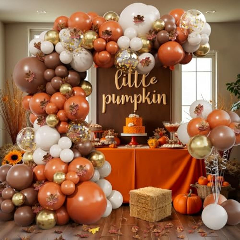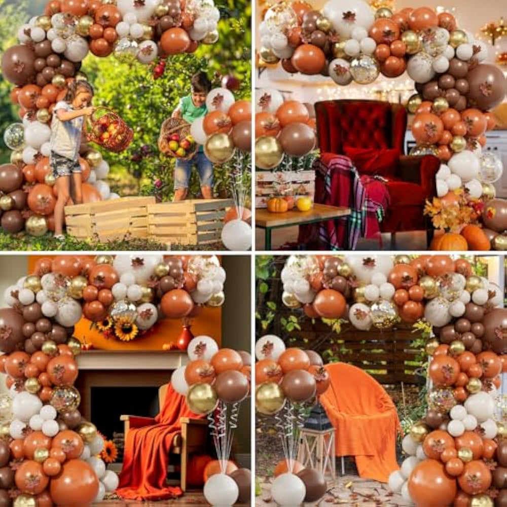 Celebrate fall with this 215-piece Thanksgiving balloon arch kit, featuring burnt orange, coffee brown, sand white, and metallic gold balloons in various sizes, plus 12-inch gold confetti balloons, 50 maple leaves, ribbon, a 16-ft balloon strip, and 100 glue dots for easy assembly. The rich autumn colors and natural maple leaf accents create a warm, festive atmosphere, perfect for DIY fall-themed parties, photo backdrops, or Thanksgiving decorations. Made from thick, durable latex, the balloons inflate easily with air or helium, allowing you to craft a stunning seasonal arch with clusters and garlands.