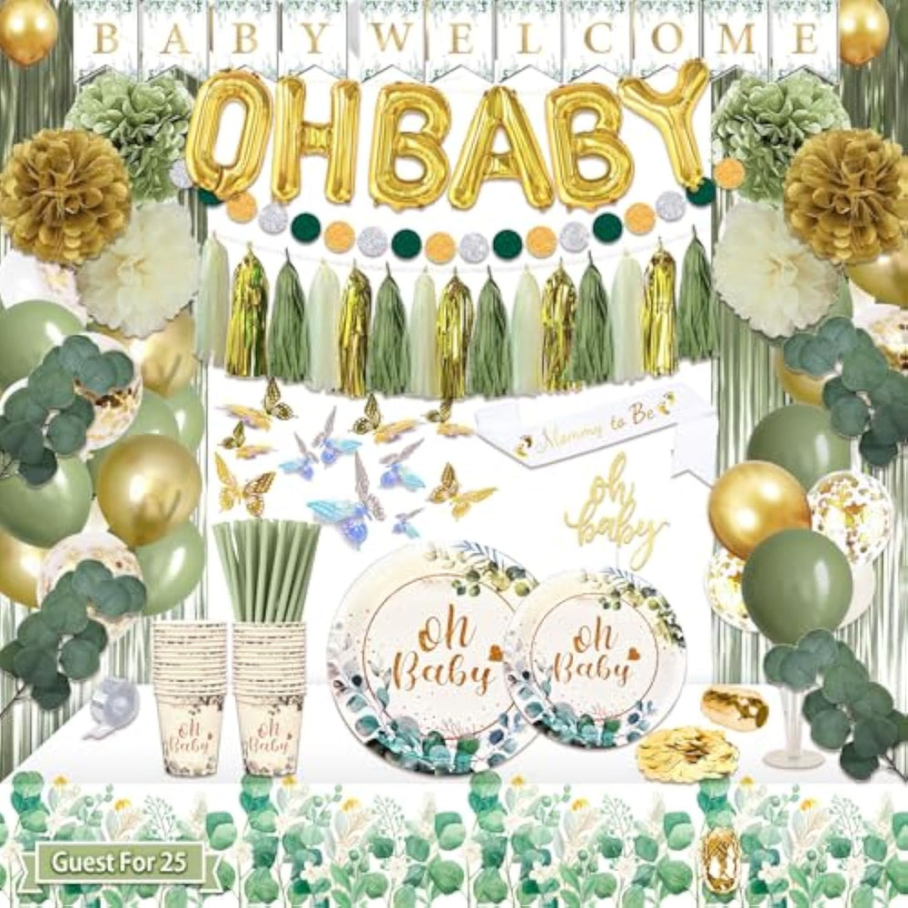This 217-piece sage green baby shower decoration set has everything you need for a stylish and effortless celebration. Designed for 25 guests, it includes 9-inch and 7-inch plates, 9oz cups, straws, a sage green tablecloth, and an elegant eucalyptus leaf theme. The set also features an "OH BABY" banner, foil balloon, cake topper, butterfly decorations, paper pompoms, a balloon stand kit, and a 63-piece balloon set. With a "Mommy to be" sash, tassel garland, and fringe curtains, this all-in-one kit creates a charming and sophisticated atmosphere while making party planning simple and stress-free.