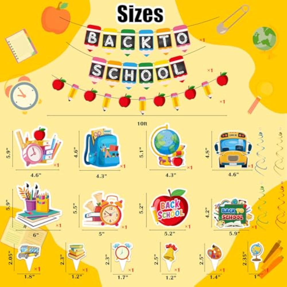 | Back To School Decorations Decorations: Includes 3Pcs Banners,8Pcs Hanging Swirls With Cutouts,4Pcs Double Hanging Swirls,6Pcs Cake Toppers,Totally 21Pcs | | Easy Install:Each First Day Of School Decorations Hanging Swirl Comes Pre-Assembled With A Plastic Hook On Top For Easy Use. You Can Hang Them Anywhere You Like | | Size:Banners Are 10Ft Approx.;Hanging Swirls Can Extend To Approx. 29’’;Cutouts Of Hanging Swirls Are 5.9”X4.6”,4.6”X4.3”,5.1”X4.3”,And More;Designs Include “Back To School”,”School Bus”,”Bag”And More | | Material:Banners Are Made Of Paper Cards; Hanging Swirls Are Made Of Paper Cards And Plastic And Are Double-Sided Printed | | Application:Perfect For Decorating Classrooms, Walls, Offices, Homes And More To Create A Welcoming Back To School Atmosphere | |