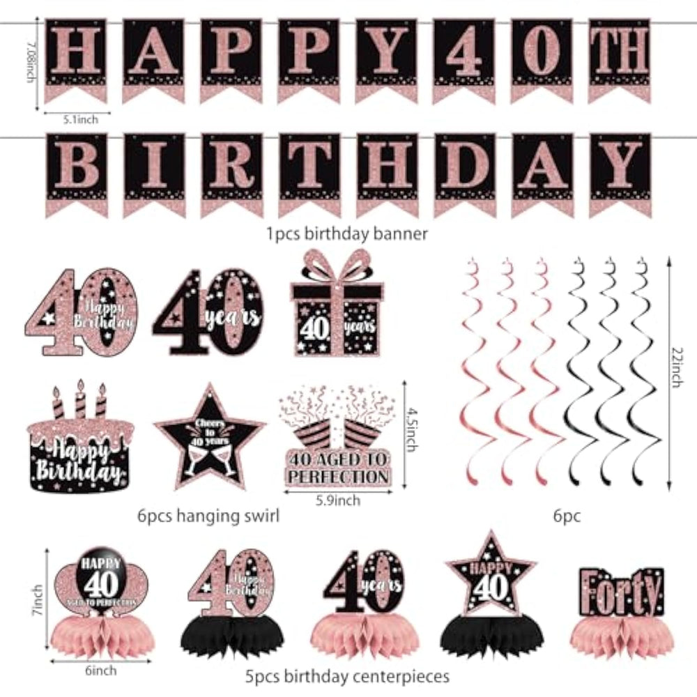 This 40th birthday decoration set includes rose gold banners spiral decorations embroidered balls honeycomb ornaments a 40 candle shoulder strap flags and rose gold foil balloons providing everything needed to throw a memorable party The banner is made from durable lightweight polyester that is foldable washable and tear resistant while the included tablecloth is crafted from thick PE material that is waterproof portable and disposable making cleanup easy Featuring a stylish rose gold and black color scheme the glitter banners and hanging swirls add elegance and fun to the celebration Each card comes with a pre cut hole and hooks for easy assembly making it ideal for photo opportunities These decorations are perfect for creating a stunning indoor or outdoor backdrop especially suited for women celebrating their 40th birthday.