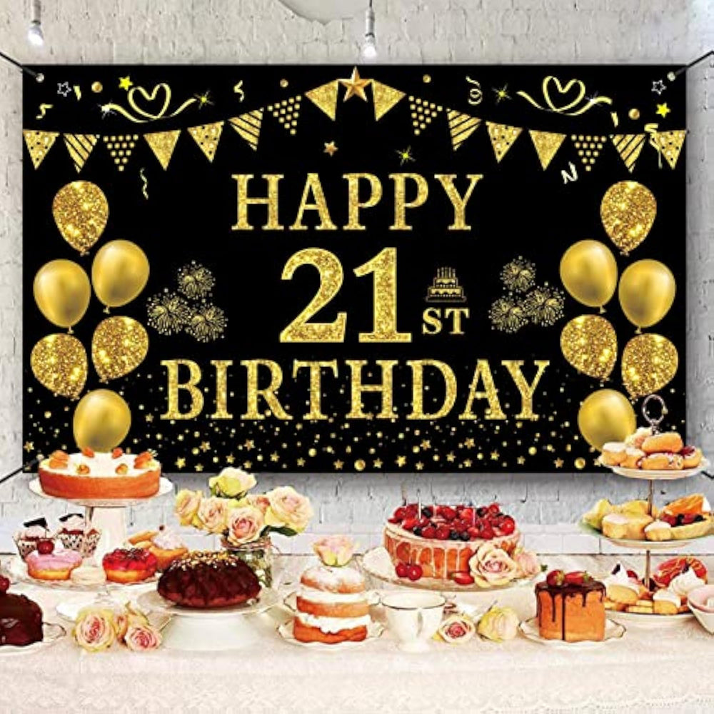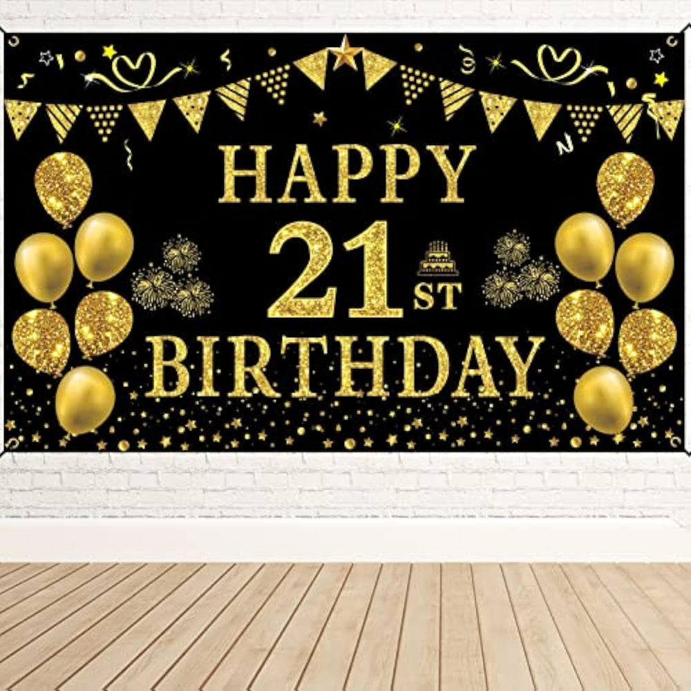 [Supper Value Size] - The 21St Birthday Banner Is 5.9Ft(Width)X3.6Ft(Heigth) / 70.8 X 43.3 Inches. It Is Large Enough For Your Birthday Party. This Banner Will Heighten The Excitement Of The 21St Birthday Party. The Golden Is Not Really A Golden Light, Just The Effect Of A Golden Flash Of The Backdrop. | [Perfect Decoration] - Its Size And Pattern Are Very Suitable For Birthday Cake Background And Photographic Background. It Is High Quality, Seamless, Durable, Lightweight, Non-Fading And Easy To Carry. The Pattern Is Digitally Printed With High Quality And High Resolution. | [Various Applications] - The Black And Gold Birthday Party Backdrop Is Suitable For 21St Birthday Party Banner Decoration. It Also Can Be Used As Wallpaper, Curtain, Backdrop For Photo. | [Exquisite Design] -These Vivid Patterns Were Printed By High-Quality Digital Resolution, Such As The Extra Large Gold Balloons, Stars, Large 21 Numbers And So On. It Will Make Your Birthday Unforgettable. | [Easy To Use]- 21St Birthday Banner Come With A Roll Of Rope Which Allow You To Pass The Rope Through The Four Corners Of The Banner. Then Hang It On The Tree, Wall And Anywhere You Want. |