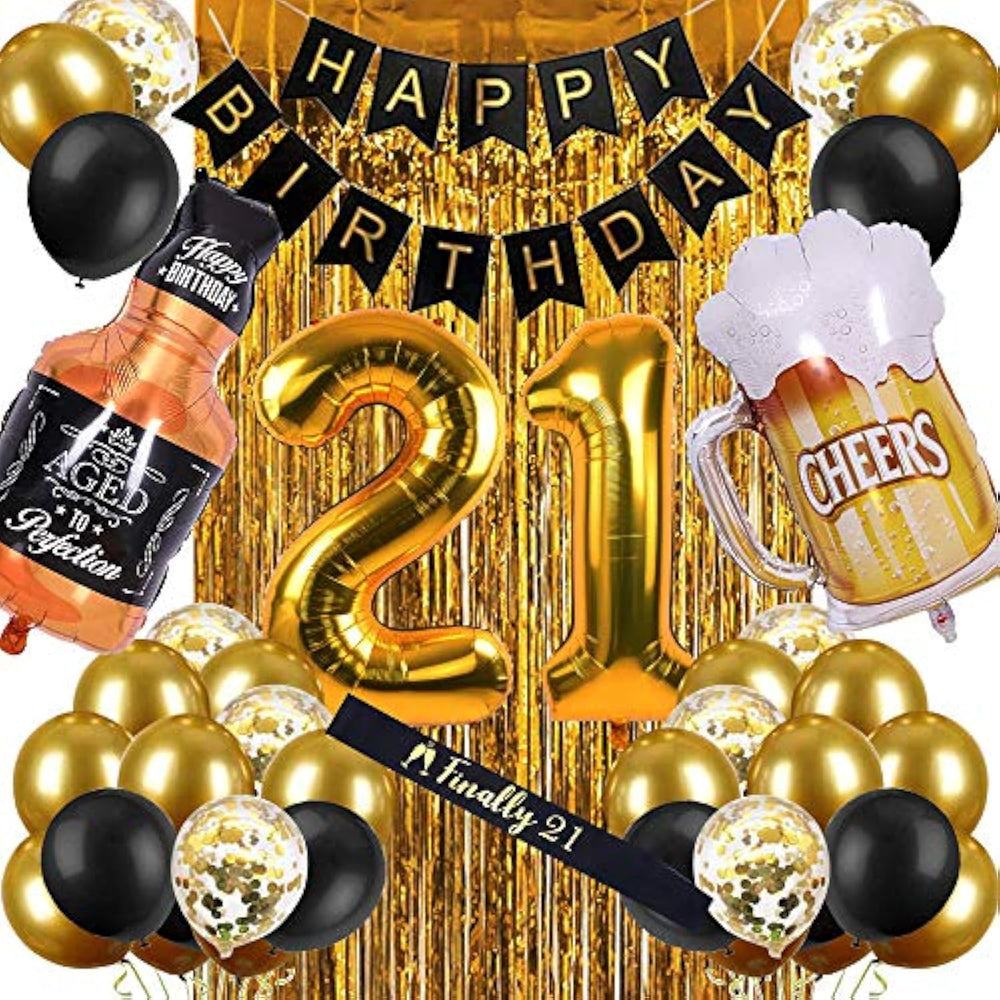 21St Birthday Party Supplies: This Black Gold Theme Birthday Decorations Are Indeed A Perfect 21St Birthday Gift For Her Or Him . The Birthday Party Kit Is Suitable For Birthday, The Birthday Party Decor, Will Definitely Bring More Joy To Your Party. | Quality 21St Birthday Decorations: The 21St Birthday Kits Are Made Of Safe, Eco-Friendly Premium Material: A Set Of Recyclable Birthday Banner, Long-Lasting Thick Balloons, A Gold Curtain As A Shining Backdrop And A Sash To Indicate Your Important 21St Birthday Is Coming. | Happy 21St Birthday Decor Set Includes: 1 X Happy Birthday Banner, 10 X Metallic Gold Balloons (12 Inch), 10 X Black Balloons(12 Inch), 5 X Gold Confetti Balloons (12 Inch), 1 X Gold Number Balloon "2" (40 Inch), 1 X Gold Number Balloon "1" (40 Inch), 1 X Gold Fringe Curtain (3.28 X 6.56Ft), 1 X "Finally 21 "Sash, 1 X Roll Glue Dot, 1 X Ribbon, 1 X Straw. | Easy To Use 21St Birthday Decor: No Need To Assemble, Just Use A Straw To Blow The Foil Balloon And A Pump For The Latex Balloons. | Our Promise For 21St Bday Decoration: To Celebrate A New Life Period, It'S Worth Preparing A Distinctive 21St Birthday Party For Yourself Or Your Family. Also, Each 21St Birthday Decorations Set Has Been Carefully Inspected To Ensure A Satisfactory 21St Birthday Decoration For Her Or Him. |