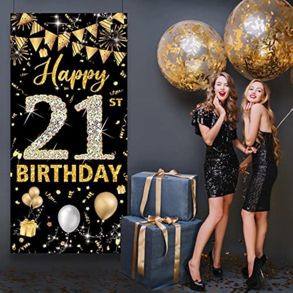 Celebrate in style with this 21st birthday door banner, measuring 6.1ft x 3ft and made from durable, weather-resistant polyester fabric—perfect for indoor or outdoor use. Featuring a bold black and gold design with simulated glitter accents and festive balloons, it instantly adds flair to your celebration. Equipped with 4 nickel grommets, it’s easy to hang on doors, walls, or use as a photo backdrop or party centerpiece. Ideal for both him and her, this reusable banner is a must-have for unforgettable 21st birthday decor.