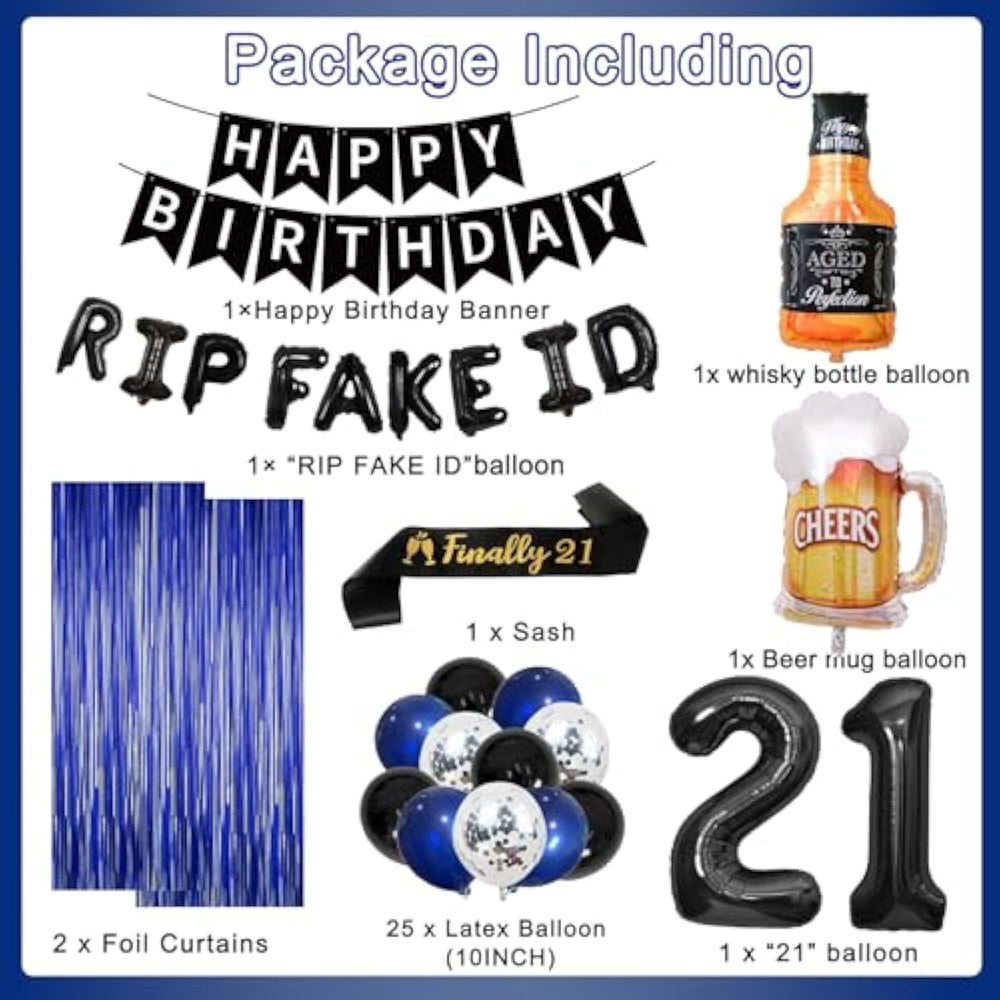 | [21St Birthday Decor] - Our 21St Birthday Party Set Includes 1Pc "Happy Birthday" Banner, 1Pc Black 21St Birthday Sash, 1 Set "Rip Fake Id" Balloons, 25Pcs Latex Balloons, 2Pcs Blue Fringe Curtain, 2Pcs Beer Cup Balloons And Number "21" Balloons. The Entire 21St Birthday Party Set Has Been Blue And Black In Color, Featuring Beer Cup, With A Beautiful And Fun Design, And Plenty Of Quantity For Your 21St Birthday Decorating Needs | | [Large Birthday Background] - The Size Of The "Happy Birthday" Banner Is 78.7 Inches / 6.5 Ft. The Banner Needs To Be Assembled By Yourself And Can Be Spaced Any Way You Want, With Fringe Curtain And Balloons To Make Up A Beautiful Background, Wearing Sash, It'S Perfect For Photos. Take Some Beautiful Photos On This Happy Day And Make Deep And Precious Memories | | [Widely Used] - Suitable For 21St Birthday Party, Beer Themed 21St Birthday Party, Fake Id Party And Girls/Boy 21St Birthday Party. Decorate Your Home, Room, Or Outdoors On This Special Day, Create A Wonderful Atmosphere, And Have A Happy And Memorable 21St Birthday Party | | [Easy To Assemble]- This Product Is Folded Package, The 21St Birthday Sash Will Have Creases, You Can Use A Low-Temperature Iron To Iron Out The Creases, The Banner Needs To Be Assembled By Yourself, Use The Included String To Hang It Anywhere. Everything Is Very Easy To Assemble, The Assembly Steps Will Not Be Complicated, You Can Set Up The Scene As You Like, Very Diy Fun | | [Durable Material] - The "Happy Birthday" Banner Is Made Of Paper Cards, The 21St Birthday Set Is Sturdy, Non-Reflective, Lightweight And Easy To Carry; The Pattern Is Printed Clearly, The Print Is Bright, Colorfast And Very Durable | |