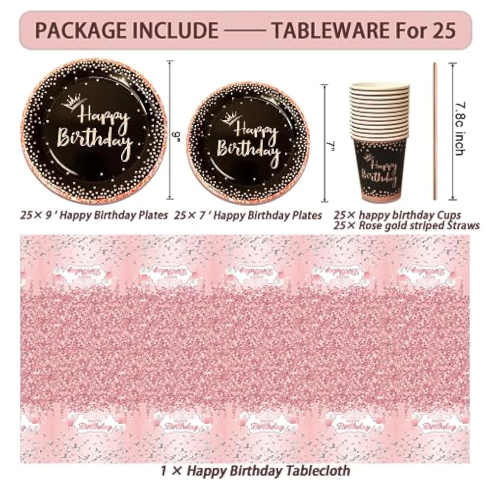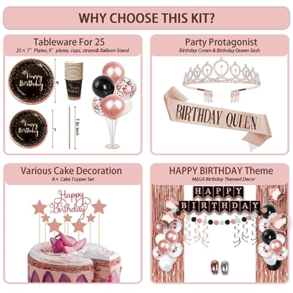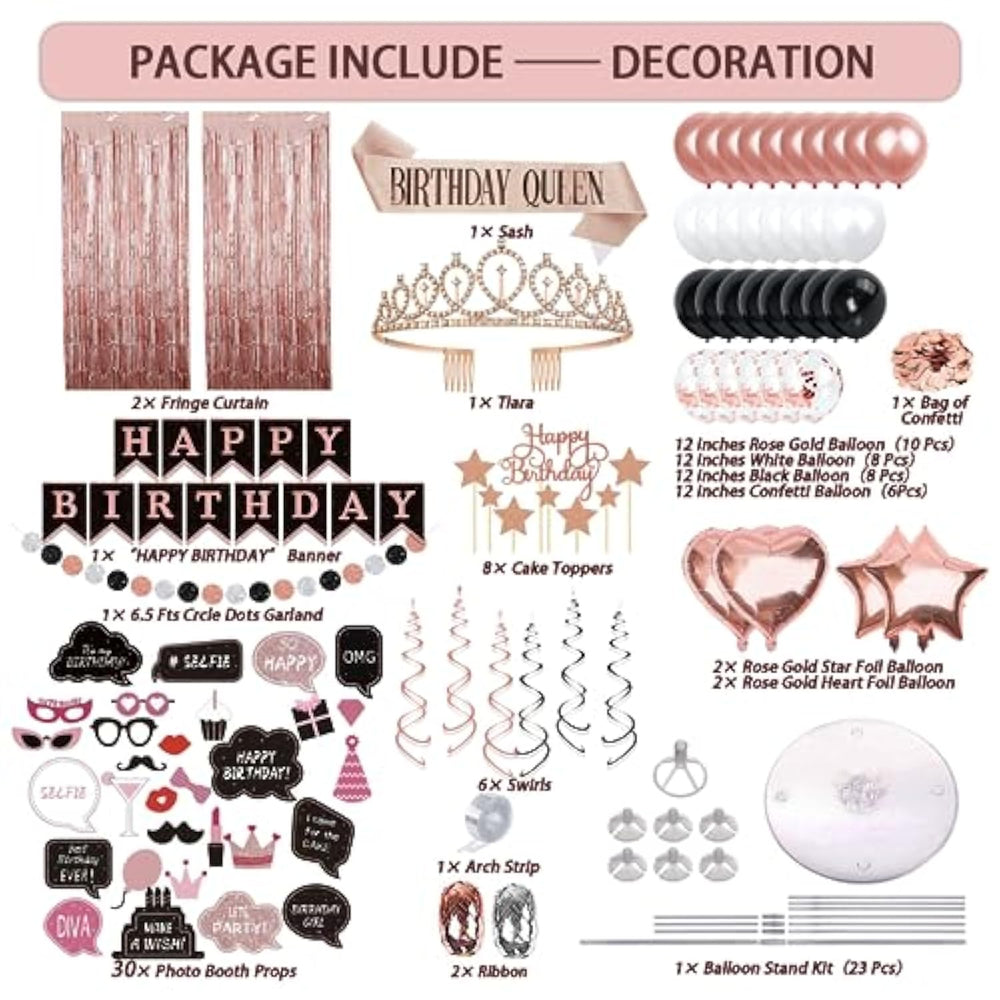 Make your birthday celebration unforgettable with this all-in-one 229-piece Birthday Decoration Set designed for women. This comprehensive kit includes everything you need to host an elegant and fun party. It features 25 plates and cups in a stunning rose gold and black design, along with straws, photo booth props, and a tiara and sash for the guest of honor. The set also includes a beautiful rose gold tablecloth, two rose gold fringe curtains, and a "Happy Birthday" banner to add a touch of glamour to your party space. For cake decoration, the kit includes eight "Happy Birthday" cake toppers, while the foil and latex balloons, hanging swirls, and balloon stand kit provide even more opportunities to enhance your party decor. Whether you're celebrating a milestone or simply enjoying another year, this set will ensure your celebration is as stylish as it is fun.
