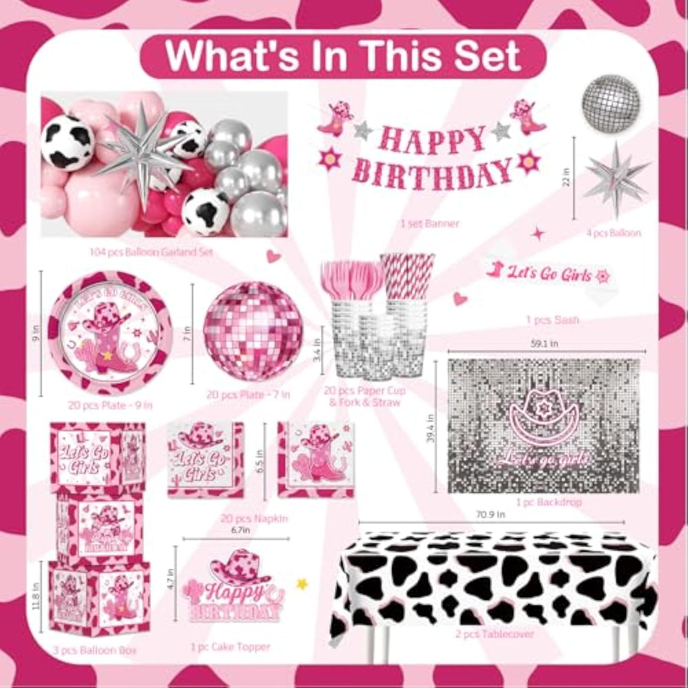 | ?Package Included?:Disco Cowgirl Birthday Party Decorations Include 1 Happpy Birthday Banner, 1 Cowgirl Birthday Backdrop, 20Pcs 7-Inch Disco Cowgirl Plates, 20Pcs 9-Inch Cowgirl Birthday Plates, 20 Forks, 20 Straws, 20 Napkins And Cups, 1 Sash, 4 Foil Balloons, 3 Balloon Boxes, 2 Cowgirl Party Tablecloth (70.9 X 42.5 In), 104 Disco Cowgirl Balloons, 1 Cake Topper, Our Cowgirl Birthday Decorations Kit Saves You Time And Money By Eliminating The Need To Purchase These Decorations Individually. | | ?Quality Materials?: Western Cowgirl Birthday Party Decorations Are All Made Of Safe And Quality Materials, The Cowgirl Birthday Party Plates Are Made Of Durable 300 Gsm Thick Paper, Which Is Not Easy To Deform And Wrinkle When Holding Food And Drinks. The Cowgirl Birthday Tablecloth Is Made Of Plastic, Which Is Waterproof And Oil-Proof. The Disco Cowgirl Backdrop Is Made Of Polyester Cloth, Which Is Durable, Easy To Store And Carry. | | ?Easy To Assemble?: Cowgirl Themed Party Decorations, We Provide Balloon Chain Installation Instructions, You Can Assemble According To Our Main Pictures. The Balloon Is Made Of Latex And Should Be Inflated To 85% Capacity For Optimal Use. For Disco Ball Foil And Star Foil Balloons, After Inflation Is Completed, Please Pinch The Inflation Port Flat. The Air Outlet Will Be Automati