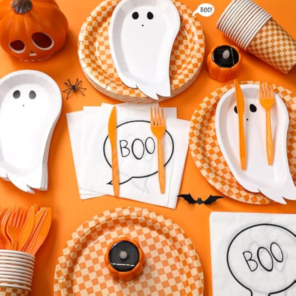 | Halloween Tableware Set: You Will Receive 24 Sets Of Orange Halloween Tableware, Including 24 Ghost Paper Plates, 24 Plaid Round Orange Halloween Plates, 24 Boo Napkins, 24 Orange Halloween Paper Cups, 24 Orange Forks, And 24 Orange Knives; This Paper Tableware Set Makes Your Halloween Theme Party Interesting And Attractive | | Safe Materials: Ghost Plates, Boo Napkins, And Cups Are Made Of Safe Paper, And The Knives And Forks Are Made Of Durable Plastic, Non Toxic Materials, Safe To Use; Cute Halloween Plates And Napkins Set Create A Spooky Halloween Baby Shower Party Atmosphere And Leave Happy Memories For Your Friends And Family | | Suitable Size: The Paper Ghost Plates Are About 7.09 Inches In Size, The Diameter Of The Round Plates Is 9 Inch, The Halloween Cup Capacity Is 9Oz, And The Napkin Size Is 6.5 X 6.5 Inches; The Right Size Halloween Party Dinnerware Set Is Practical And Beautiful, And Is An Ideal Supplement To The Halloween Birthday Party Table Decoration | | Easy To Use: Happy Boo Day Serveware Is Suitable For Indoor And Outdoor Use, Easy To Clean, After The Party, Just Throw It Away, Saving A Lot Of Cleaning Time, And More Time To Rest Or Plan Other Activities | | Wide Range Of Uses: Our Halloween Party Supplies Are Not Only Cute Tableware, But Also A Cute Decoration, Suitable For Summer Halloween Party Decorations, Halloween Decorations, Happy Boo Day Party, Halloween Birthday Party, Ghost Party Supplies, Baby Shower, Holiday Party, And More; Enjoy This Special Time With Family And Friends On This Halloween | |