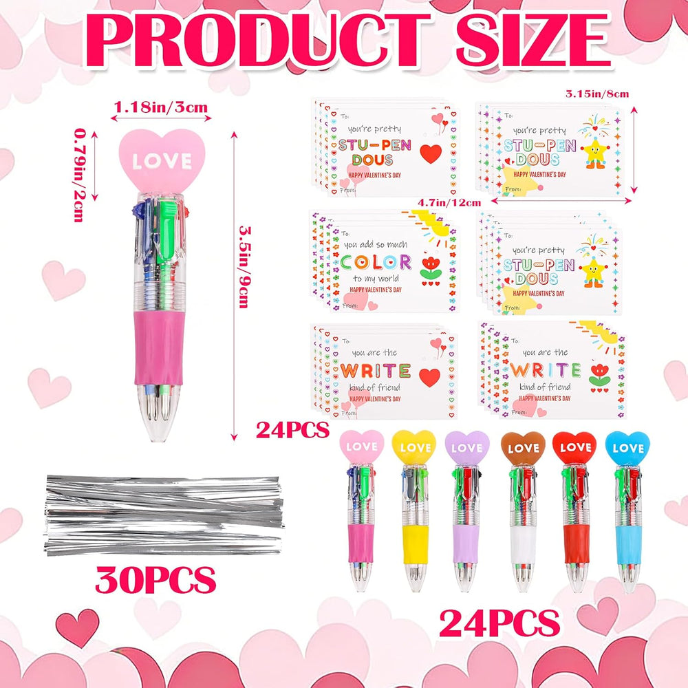 | What You Get: 24 Pcs Multicolor Retractable Ballpoint Pens And 24 Pcs Valentine'S Gift Cards With 30Pcs Twisted Ties Are Included In Total, Sufficient Quantity Can Meet Your Festive Decorative Needs. | | Size: The Plastic Mini Multicolor Pens Measure 3.9 Inch/ 9 Cm, And The Valentine Cards Are 4.7 X 3.15 Inches/ 12 X 8 Cm, Lightweight And Portable, Easy To Carry And Store. | | Valentine Heart Design: The Valentine'S Multiple Colored Pens Feature Various Colors Love Heart Topper, Including Red, Brown, Blue, Yellow, Pink And Purple. And The Inspirational Valentine Cards Are Printed With Some Blessing Words, Expressing A Positive Feeling Of Inspiration. | | 4-In-1 Multicolor Pens: The Multicolor Ballpoint Pen Contains 4 Colors, Including Red, Green, Blue And Black, You Can Switch Between Different Colors Easily, Perfect For Your Daily Use. | | Wide Applications: The Valentine Mini 4-In-1 Pens Sets Are Ideal For Valentine'S Day Party, Birthday, Anniversaries, Holiday Gifts. Also Suitable Gift For Students, Teachers, Staffs, Coworkers, Classmates. | |