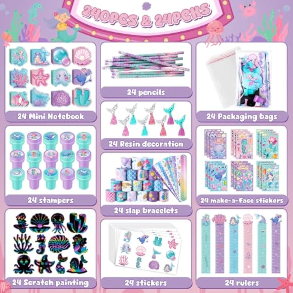 | Package Include: You Will Get 24 Mermaid Mini Notebooks,24 Mermaid Pencils, 24 Mermaid Rulers, 24 Mermaid Slap Bracelets, 24 Mermaid Stampers, 24 Mermaid Stickers, 24 Make-A-Face Stickers, 24 Mermaid Tails Toy, 24 Color Scratch, 24 Clear Gift Bags.A Complete Mermaid School Stationery Favor Set For Your Use. | | Reliable Material:Our Mermaid Party Favors Set Are Mainly Quality Paper, Plastic, Rubber, Nontoxic, Safe Material, Sturdy To Use. You Can Give These Nice Stationery Items As Mermaid Party Goodie Bag Or Classroom Gift Exchang For Classmates Or Kids, Stimulating Creativity And Concentration. | | Mermaid Gifts And Goodie Bag Fillers: Our Mermaid Partyclass Reward Prizes Stationery Set Feature Various Kinds Of Different Designs And Ocean Creature Elements, Such As Mermaid, Shells, Starfish And More To Meet Your Liking, Your Mermaid Gift Is More Popular. | | Suitable Size: Mermaid Mini Notebook About 3 X 3 Inch, Pencils About 7.5 Inch, Ruler About 1.2 X 7.9 Inch, Make-A-Face Stickers About 6.7 X 4.3 Inch, Slap Bracelets About 8.7 X 1.2 Inch, Stampers About 1.38 Inch, Stickers About 4.7 X 2.7 Inch, Mermaid Tails About 1.7 Inch, Color Scratch About 5.1 Inch,Little Mermaid Party Favors Set Fit In Most Classroom Party Goodie Bags. | | Widely Applicable: These Mermaid Birthday Stationery Can Be As A Gift To Your Child For The Mermaid Party Favor, Mermaid Party Goodies Bags Fillers, Mermaid Calss Party. Back To School Classroom Activities, Gradution Gift Etc. | |