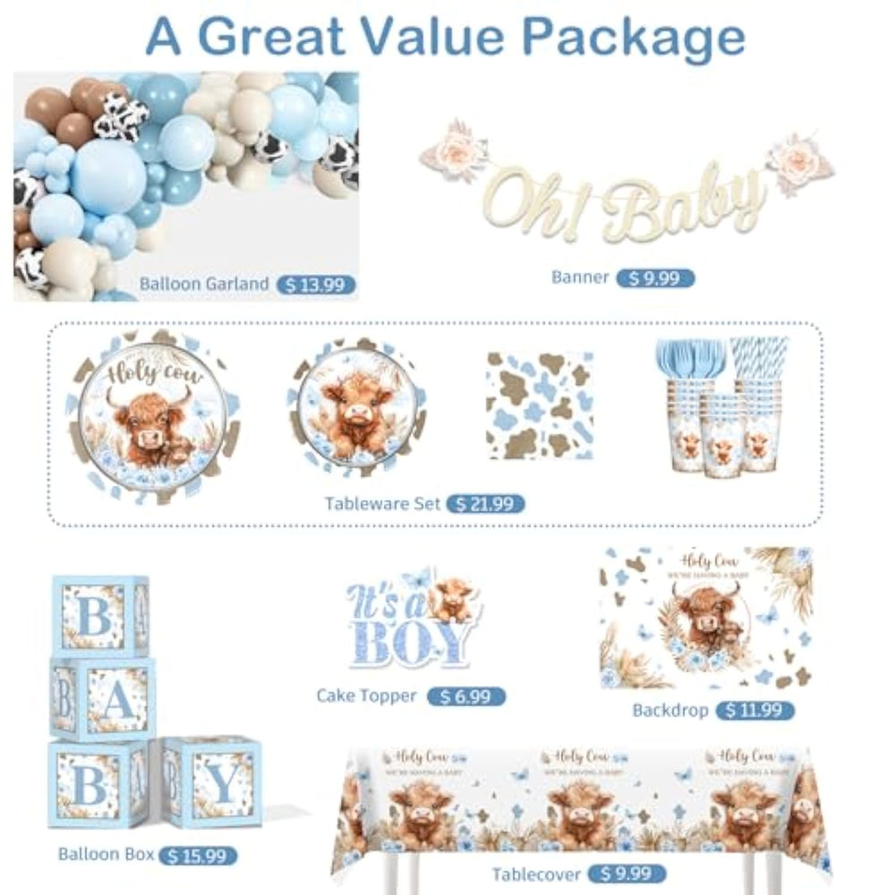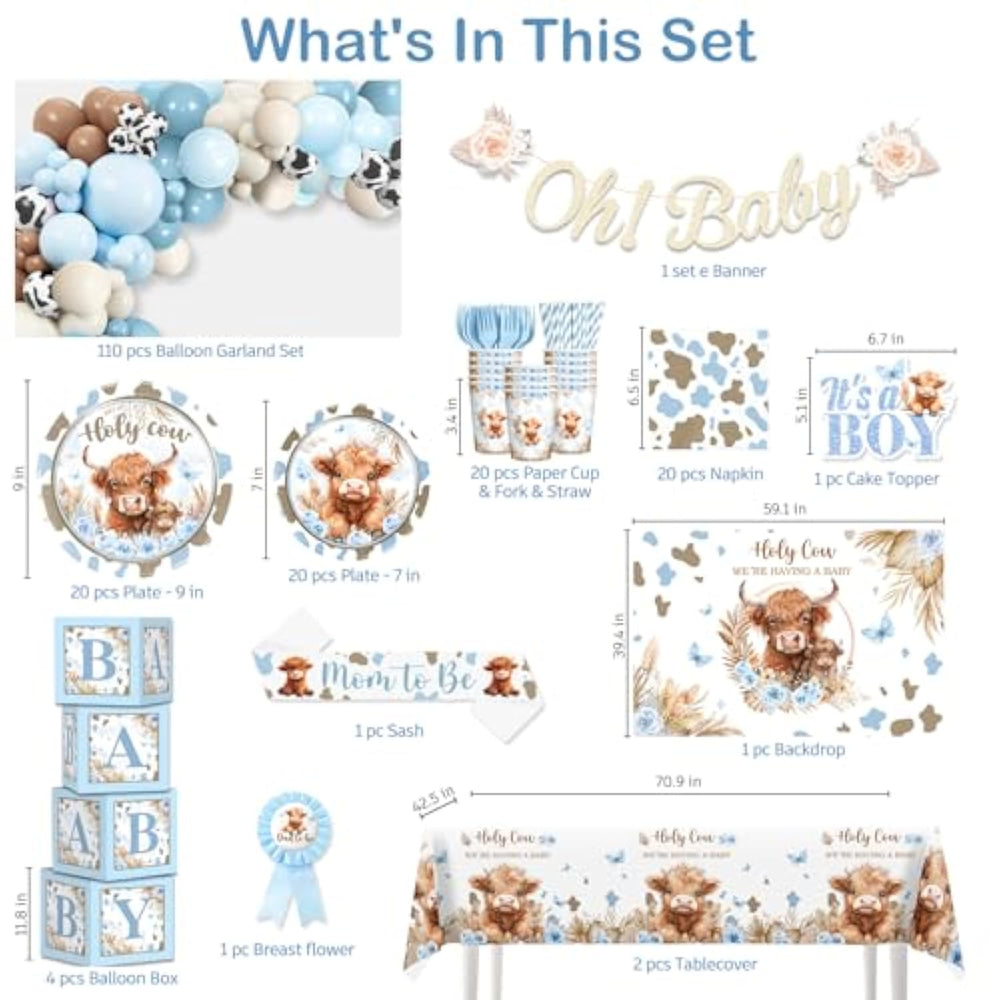 | ?Complete Highland Cow Baby Shower Decorations:? Our Cow Baby Shower Decorations Include 1 Pc Banner, 1 Pc 59*39 Inch Western Baby Shower Backdrop, 2 Pcs Cowboy Baby Shower Tablecloths, 1 Pc It'S A Boy Cake Topper, 4 Pcs Balloon Boxes, 1 Pc Mom To Be Sash, 1 Pc Dad To Be Pin, 20-Piece Set: 7-Inch And 9-Inch Plate, Napkin, Paper Cup, Fork And Paper Straw, 110 Pcs Latex Balloons | | ?Superior Materials:?The Highland Cow Tablecloths Are Made Of Plastic, Easy To Clean, The Surface Of The Highland Cow Party Plates Are Sealed With Film And Thickened, Strong And Waterproof, Most Of The Baby Boy Shower Decorations Are Made Of Sturdy White Cardboard, Which Is Clean And Pollution-Free, You Can Use Our Holy Cow Were Having A Baby Decorations With Confidence | | ?Save Your Time:?Our Highland Cow Baby Shower Decorations Are Equipped With The Materials And Instructions Needed To Assemble The Boy Baby Shower Decorations Kit, Which Can Help You Assemble Faster. Highland Cow Plates And Napkins Are Disposable And Do Not Need To Be Cleaned. You Can Throw Them Away Directly After The Cow Print Baby Shower, Saving More Time With Your Family And Friends | | ?Unique Design:?This Western Baby Shower Decorations Kit Are Mainly Brown, Blue And White, Creating A Friendly And Warm Atmosphere. The Design Incorporates Cute Highland Cattle Images, Cow Patterns, Butterflies And Other Elements, As Well As Words Such As Holy Cow We'Re Having A Baby. The Overall Layout Is Rich And Coordinated. The One-Stop Combination Can Save Parents' Time In Selection And Undertake Everything Needed For Baby Boy Shower | | ?Multiple Occasions:?Our Baby Boy Baby Shower Decorations Are Mainly For Families, Prospective Parents And Relatives And Friends Who Are About To Welcome Newborn Babies. It Is Suitable For Highland Cow Baby Shower Parties, Celebration Ceremonies Or Room Decorations. It Also Suitable For Families Who Like Nature And Animals | |