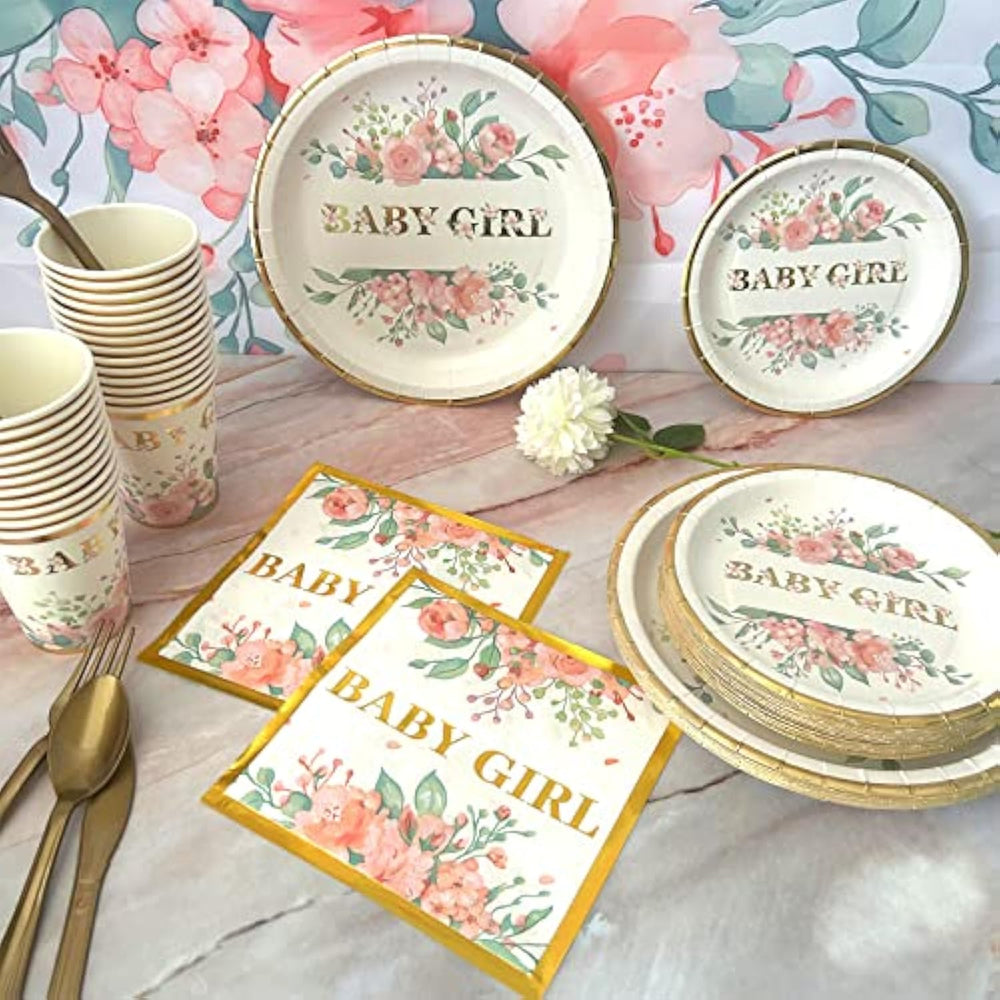 This all-in-one floral baby girl shower decoration set includes 242 pieces to help you effortlessly create a charming and elegant celebration. It features a 6 by 3.6 foot "BABY GIRL" backdrop, a 9 by 4.5 foot floral tablecloth, 25 floral dinner plates, 25 dessert plates, 25 cups, 25 napkins, and a full set of cutlery for 25 guests including forks, knives, and spoons. The set also includes 60 latex balloons in four colors, an "It's A Girl" banner, a dot glue strip, a gold ribbon, a balloon knotting tool, and a 16-foot wreath. All items are crafted from premium, eco-friendly materials—plates, cups, and napkins are made from heavy-duty, recyclable paper, while balloons are made from natural latex and foil. The BPA-free fabric backdrop and tablecloth are easy to hang thanks to a convenient rope and buckle design. With easy-to-use installation tools, this pink and gold floral party set helps you create a picture-perfect event while saving time and effort, so you can enjoy celebrating your baby girl with family and friends.