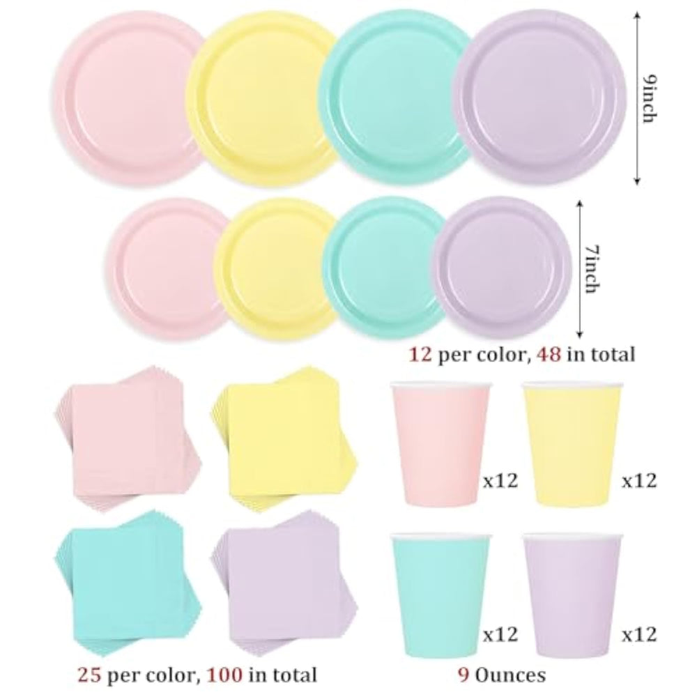 This pastel party tableware set includes 96 paper plates in two sizes, 100 napkins, and 48 cups, providing ample quantity for any celebration. Designed in a charming pastel color theme with four delicate shades, this set enhances table decor and creates an inviting atmosphere. Made from high-quality paper with a waterproof coating, the plates, napkins, and cups are disposable, safe, and absorbent, though the plates should not be used in the microwave. The nine-inch and seven-inch plates come in equal quantities, while the napkins measure 6.5 by 6.5 inches when folded, and the cups have a nine-ounce capacity. Perfect for weddings, bridal showers, birthdays, and home gatherings, this elegant dinnerware set adds a stylish touch to any occasion while ensuring easy cleanup.