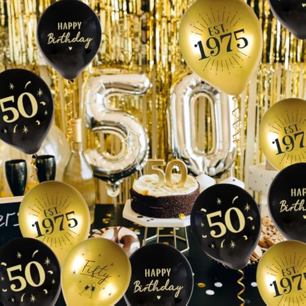 | ?Package Include?You Will Receive 24 Pcs 50Th Birthday Balloons And Two Rolls Balloon Ribbon.They Will Help To Create A Cheerful Atmosphere At Your 50Th Birthday Party | | ?Unique Design?Clearly Printed With "Est. 1975" "Happy Birthday" "50" "Fifty" On Black Gold Latex Balloons,Bright And Colorful | | ?Good Quality?These 50Th Birthday Balloons Are Made Of Thicken Latex,Long Lasting,Won'T Deflate Easily | | ?50Th Birthday Decorations?They Will Be A Great Addition To Your 50Th Birthday Party,Go Well With Black Gold Happy 50Th Birthday Decorations Such As Banner,Backdrop,Tablecloth,Cake Topper | | ?Tips?1.Please Inflate The Latex Balloons Slowly,And Don'T Inflate Too Much.2.The Balloons Have A Little Smell,Please Put It In Ventilated Area For 2 Days Before Use | |