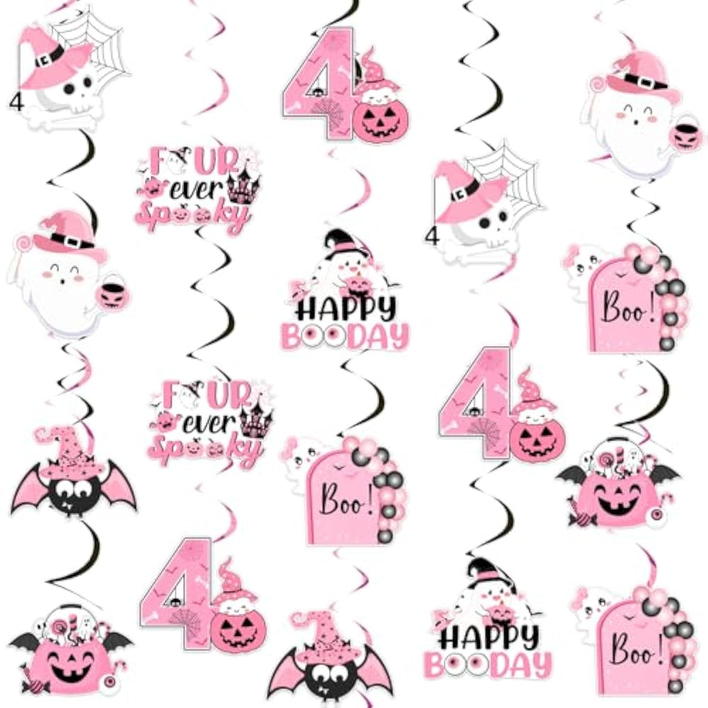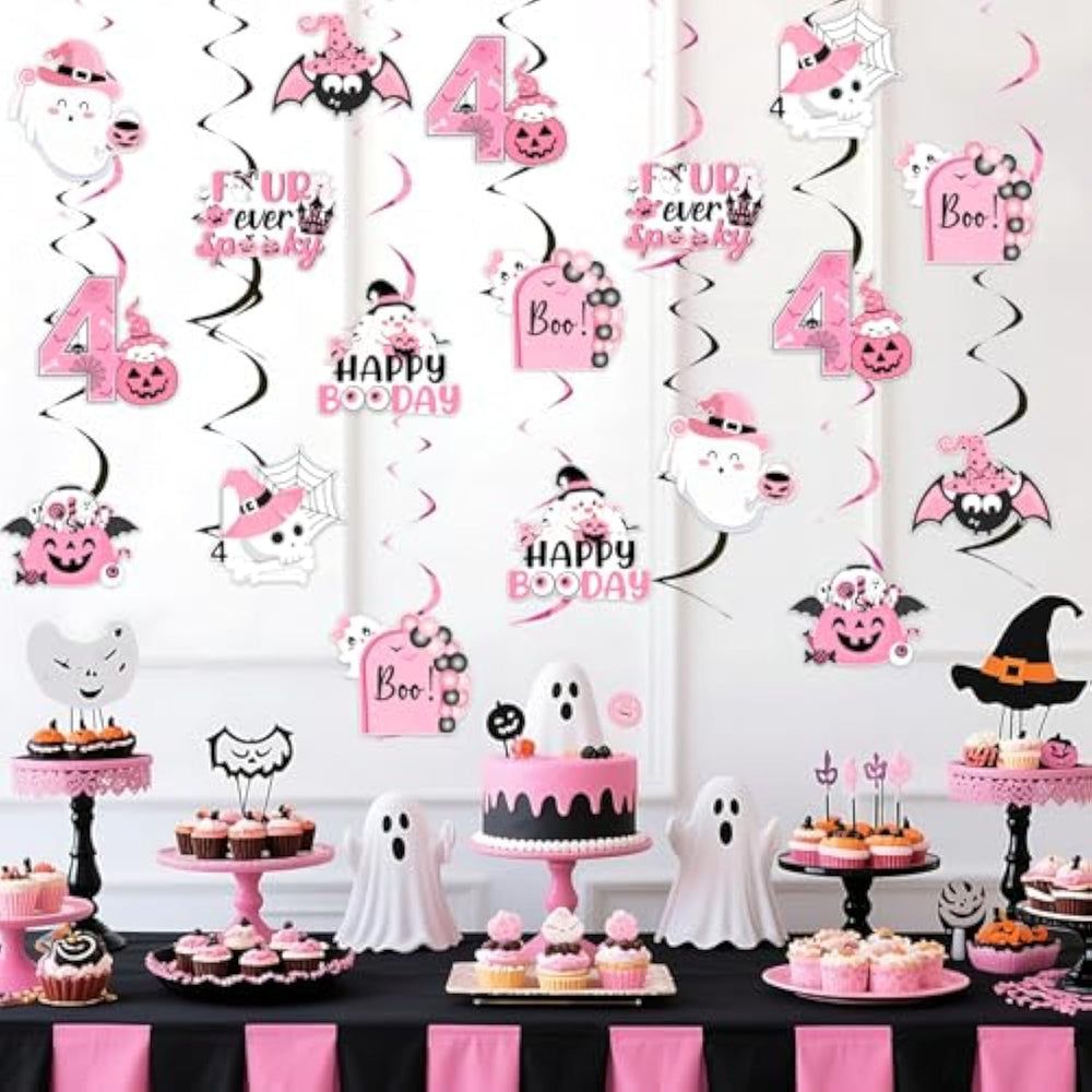 The Halloween 4th Birthday Hanging Swirls Set includes 24 pieces of festive pink and black swirls, featuring playful Halloween elements like ghosts, pumpkins, witches, and bats, along with themed lettering such as “4,” “boo!” and “Happy Boo day.” Made from durable metallic foil and quality cardstock with double-sided printing, these decorations are sturdy and resistant to bending. Each swirl comes with a plastic loop for easy hanging, allowing you to instantly elevate the party atmosphere. Perfect for Halloween birthday parties, baby showers, trick-or-treat events, or any spooky-themed celebration, these swirls add a fun and festive touch to your décor.