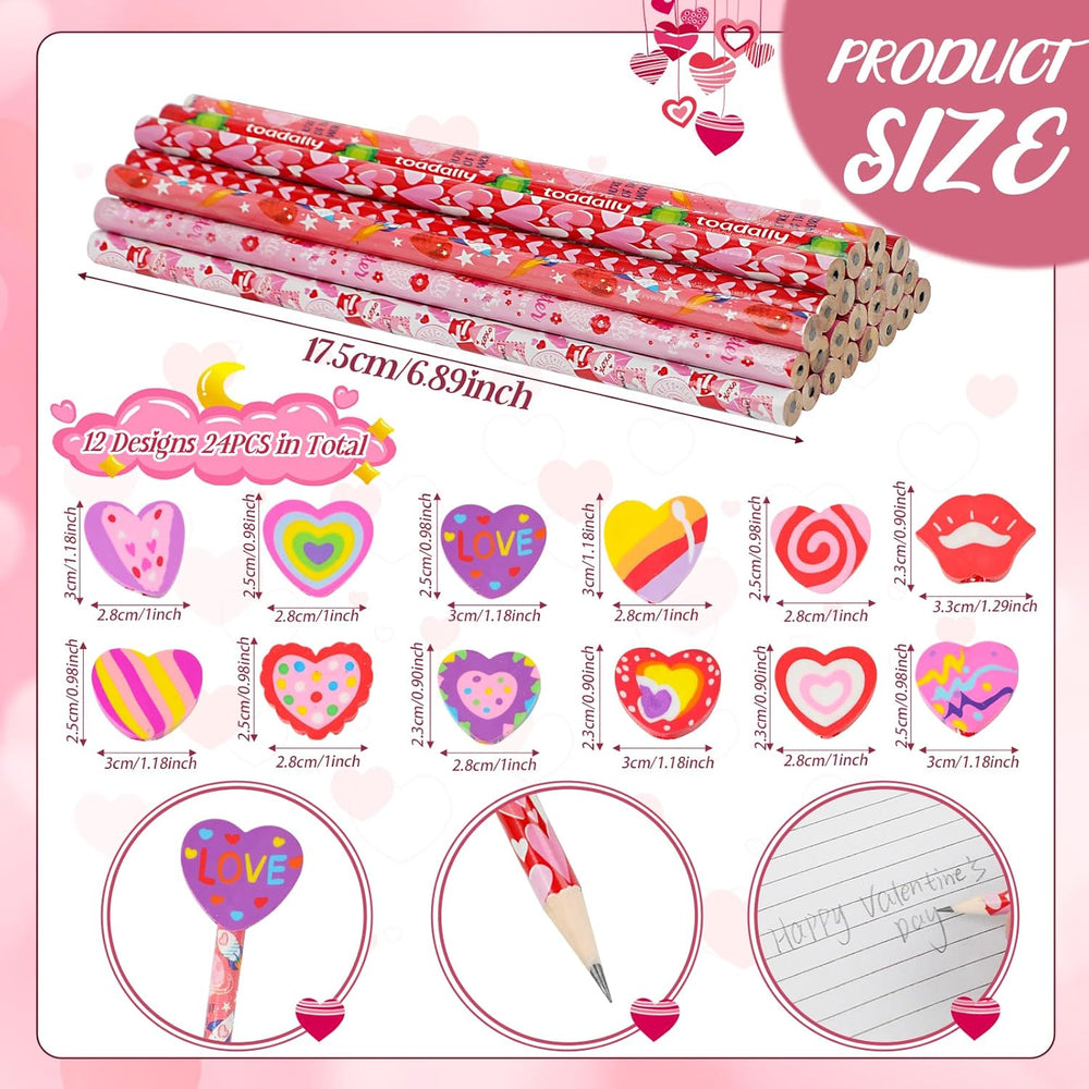 | Package Includes: 24Pcs Valentine'S Day Pencils With Erasers Are Included In Total,Covering 12 Different Styles, 2Pcs Of Each Style. You Can Freely Choose The Pattern You Like For Daily Use, Or Share Them With Friends Or Family. | | Material: These Valentine Pencils Are Made Of Reliable Wood, Easy To Sharpen, Smooth To Write, Safe And Comfortable To Grip, Suitable For Signing Or Taking Notes. | | Size: The Heart Wood Pencils Bulk Measure 6.89 Inch/ 17.5 Cm. Each Pencil Comes With An Eraser At The Top, For Correcting Writing Errors And Keep The Paper Clean. | | Valentine Heart Design: These Valentine Day Pencils Have 12 Different Designs, Including Charming Assorted Hearts And Stars, Animals, Love Words. Various Cute Valentine Designs Perfectly Meet Your Gift Needs. | | Wide Applications: These Valentines Themed Pencils Are Suitable For Valentine'S Day Party Favor, Exchange Gifts, Goodie Bag Filler,Classroom Rewards, Game Prizes. | |