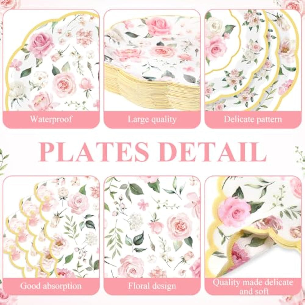 | Delicate Gifts Set: The Floral Tableware Set Includes 50Pcs 9 Inch Paper Plates, 50Pcs 7 Inch Dessert Plates, 50Pcs 9Oz Cups, 100Pcs Napkins That Can Serve 50 Guests, Creating A Visually Stunning Table Decor For Baby Shower Party And Tea Party | | Proper Size: Our Tea Party Dinnerware Combination Has Paper Plates Diameter Of Approx 9 Inches And 7 Inches, Napkins Size Of Approx 13 X 13 Inches, Paper Cups Content Of 9 Oz; Suitable For Holding Cakes, Beverages, Snacks, And Other Types Of Dinner | | Charming Design: Impress Your Guests With Our Pink Flower Paper Plates, Are Designed With Pink Flower, Green Leaves Patterns And Gold S