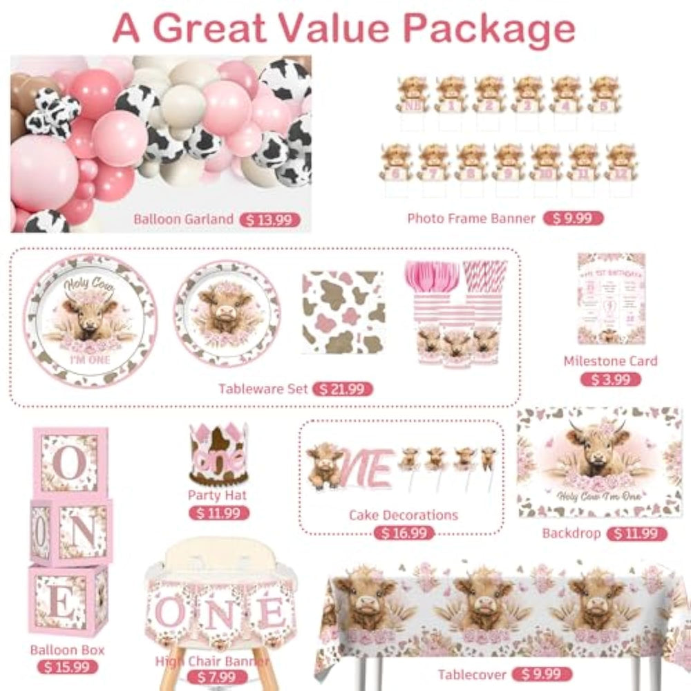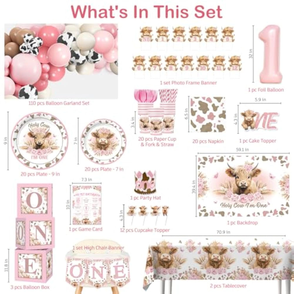| Package Includes: You Will Receive 254 Pcs Of Holy Cow Im One Birthday Decorations Complete Party Set, Includes 1 X Photo Frame Banner, 1 X Holy Cow Im One Backdrop, 110 X Balloons(5/10/12 Inches), 1 X First Birthday High Chair Banner, 1 X One Cake Topper, 12 X Cupcake Toppers, 1 X Cow Birthday Hat, 1 X Gaming Card, 3 X Balloon Boxes, 1 X Number 1 Foil Balloon, 2 X Highland Cow Print Tablecloths(70.9 X 42.3 Inch), A Set Of Tableware For 20 Guests, Including 300 Gsm Thick Paper Plates 9 Inch/7 Inch, Forks, Paper Straws, Napkins And Paper Cups | | Materials: Holy Cow I'M One Birthday Decorations Girl Uses Eco-Friendly Material. All Paper Products Like Banners, Highland Cow Plates, And Napkins Are Made Of Safe And Quality Paper Materials, Thick And Durable, No Matter Indoor And Outdoor Use. Cow-Themed Balloons Are Made Of Durable Latex Materials, But It'S Recommended To Inflate Them 80-85% To Avoid Exploding. Hosting A Party With This Holy Cow Im One Package Is A Great Idea To Make Your Family And Friends Happy, And Can Fill Your Party With Atmosphere | | Holy Cow Themed 1St Birthday Decorations: Decorate Your Party With Highland Cow Birthday Party Decorations, These Balloons, Plates And Napkins, Birthday Banner, And Tablecloths, Etc. It Feels Like Being In Its World. It Is A Great First Birthday Decoration For Girls, And Is A Great Way To Create An Inspiring Birthday Party Decoration With Friends And Family | | Save Your Time: The Cow 1St Birthday Party Decorations Disposable Dinnerware Set Can Be Cleaned Up In Seconds After The Party! Cow Print Plates Are Completely Disposable, So The Tableware Does Not Need To Worry About Cleaned. You Can Spend More Time With Your Family And Spend Less Time Cleaning Up After The Party | | Quality