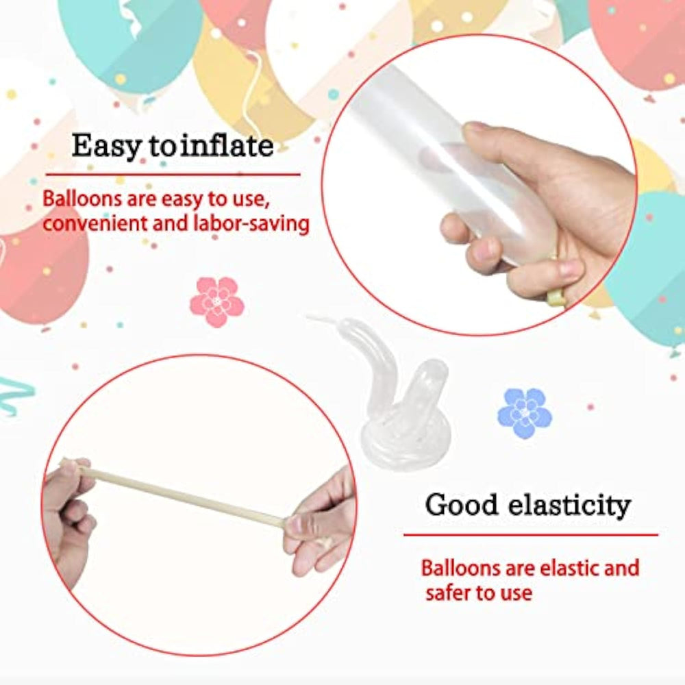 | Premium Quality And Durable: Our Animal Balloons Are Made Of Natural Latex, Which Is 20% Thicker Than Ordinary Modeling Balloons And Can Be Easily Folded Into Different Shapes. Our Factory Strictly Controls Every Step Of Purchasing, Production And Making To Ensure The Quality Of The Products Are Top Quality. 360 Balloons Can Keep A Good Shape For A Long Time After Inflating, Very Suitable For Professional Balloon Artists. | | Perfect Gift: You Will Receive 100 Long Skinny Balloons Inside The Package, Which Is A Sufficient Quantity To Meet Your Decoration Needs Well. 260Q Balloons Can Be Twisted Into Various Shapes, Such As Animals, Flowers Or Any Shape You Like, For Decorating Your Party Or As A Lovely Gift For Friends. The Twisting Balloons Bring More Color And Vibrancy To Your Celebration And Are Great For A Variety Of Party Decorations. | | Applicable Occasions: Magic Balloons Are Suitable For Various Occasions, Such As Arch Parties, School Activities, Birthdays, Weddings, Engagements, Clown Props, Anniversaries, Festivals, Baby Christenings, Magic Shows, Children'S Parties, Unicorn Parties, Rave Parties, Candy Parties, Pre-Schools, Annual Meetings, Parent-Child Interactions, Family Gatherings, Children'S Day, Valentine'S Day Parties, Easter, Thanksgiving, Christmas, Halloween And Other Holiday Indoor Or Outdoor Party Decorations. | | Easy To Use: Each Uninflated Long Balloon Is 11.8 Inches Long And Up To 51 Inches When Inflated. Please Use A Hand Pump To Inflate The Long Balloon, The Twisted Balloon Is Perfect For Making Various Shapes, Such As Flowers, People, Plants, Butterflies, Hats, Dinosaurs, Birds, Puppies And So On. Novelty And Chic, Easy To Operate, Let You Experience The Irreplaceable Fun Of Animal Art Diy! | | Diy Toys: Enhance Family Bonding And Improve Children'S Ability To Use Their Brains. Animal Balloons Are A Very Good Set Of Parent-Child Game Equipment. On Weekends Or After Dinner, Parents And Children Sit Together On The Sofa, Diy Making Different Shapes Of Long Balloons, Not Only Enhance The Family Atmosphere, But Also Stimulate The Creativity And Imagination Of Children, So That Children Away From The Control Of The Cell Phone, To Promote The Development Of The Child'S Brain. | |