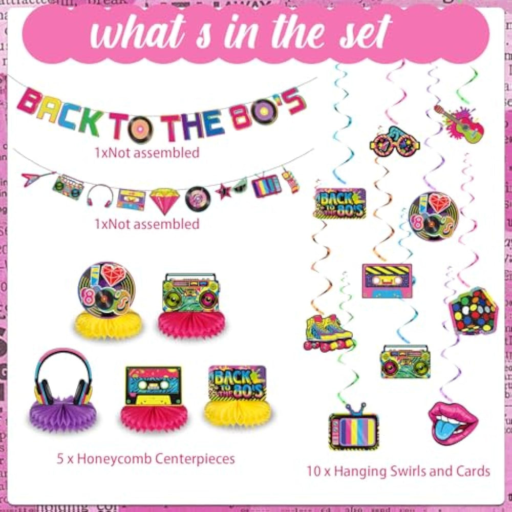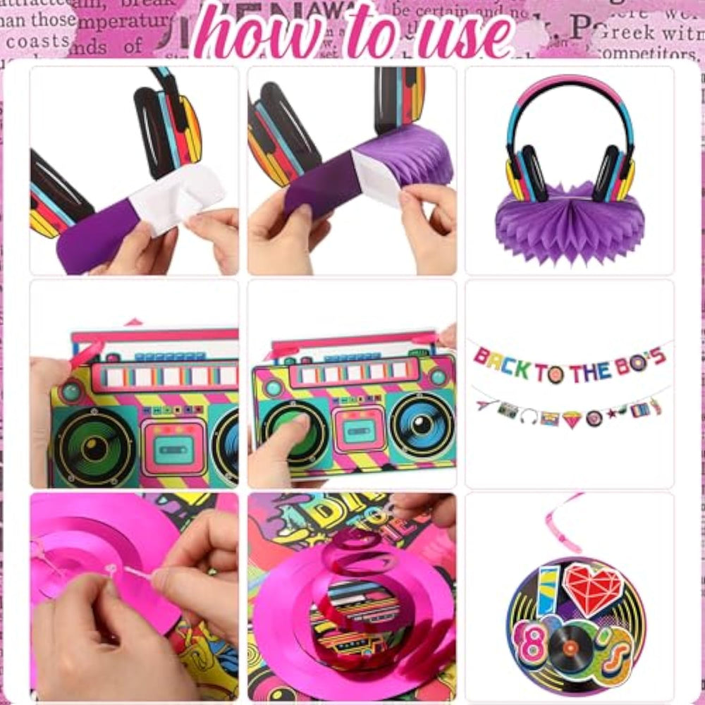 | Back To The 80S Party Decorations: You Will Receive A Package Including 1 Piece Of Back To The 80S Banner And 1 Piece Of 80S Retro Elements Banner, 10 Pieces Of Hanging Swirls, 10 Pieces Of Hanging Cards And 5 Honeycomb Centerpieces, Sufficient Quantity And Colorful 1980S Hip Hop Retro Birthday Party Hanging Swirls, A Novel Combination To Bring Elegant Atmosphere For Your Table Decoration, Give You A Beautiful Party Experience | | Quality Material: These 80S Theme Birthday Party Decorations Are Mainly Made Of Quality Card Paper, Beautifully Printed, Non Fading, No Odor, Bright Colors With 80S Hip Hop Logo Style Design; And These 80S Retro Party Ornaments Are Sturdy And Reliable, So You Can Put Them Away At The End Of The Party For The Next Use | | Fun To Install: These 80S Party Banner Decorations Are Not Assembled, You Can Install With Your Friends And Families; The 1980S Ceiling Swirl Decorations Are Also Easy To Build Up, Just Use The Buckle Between The Swirl And The Cardboard, Then Hang It Where You Want To Decorate; And Other Rock Hippie Party Decors Allow You To Put Them In Your Favorite Display Area, Easy For You To Use | | Welcome Back To The 80S: Maybe You Are A Person Born In The 80S, Or You Are A Big Fan Of Retro; These 80S Theme Party Decorations Have Funk And Modern Elements Such As Sunglasses, Cds, Tv, Rock Bass, Etc., Designed For You, Then You Can Add A Retro Atmosphere To Your 80S Theme Party | | Wide Applications: These 80S Hanging Swirls Supplies Can Be Hung On The Ceiling Or Other Places Such As Windows, Mantels, Etc.; They Are Suitable For Hip Hop Parties, Retro Parties, Rock Parties, 80S Disco Parties And So On; Our Classic Design Makes Sure That Your Hanging Decorations Will Be The Centerpiece Of All Your 1980S Decorations | |