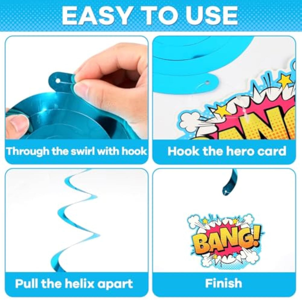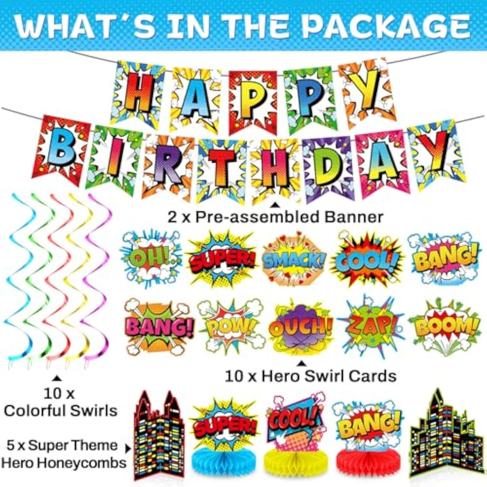 | Package Quantity: Our Product Includes 1Pc "Happy Birthday" Hero Themed Banner, 17Pcs Hero Themed Cards, 6Pcs Hero Themed Honeycomb Balls Centerpieces And 10Pcs Colorful Foil Swirl Decorations. Each Card Pattern Is Exquisite And Can Create A Very Strong Atmosphere For Hero Birthday Themed Party Decorations. | | The Perfect Size And Material: The Size Of Honeycomb Ball Is About 5.5*1.5Inches (14*3.8Cm),It'S Easy To Open And Close And Easy To Store And Carry Without Taking Up Much Space. Our Each Foil Swirl Can Be Extend To About 24-28 Inches Long,Made Of Shiny And Durable Pvc,Not Easy To Hang And Bend, And Not Easy To Break. These Hero Themed Cards Are Made From High Quality Materials And Printed On Both Sides For Durability And Fade Resistance. | | Exquisite Patterns: This Super Theme Party Decorations Are Nice Supplies For Hero Birthday Party Decorations. A Variety Of Cards Can Add A Great Ambiance To Super Themed Party. These Fun Party Decorations Provide The Perfect Decor And Backdrop For Your Party. | | Easy To Use: Step1: Choose A Card And Two Honeycomb; Step 2: Peel Off The Sticker On The Back Of The Honeycomb; Step 3: Paste The Honeycomb Into The Card; Step 4: Put It On The Table. Finally, You Will Get A Complete Honeycomb Ball Centerpieces Decorations. Each Foil Swirl Has A Clear Plastic Hook At The Top For Easy Hanging. All You Need To Do Is Gently Separate The Foils. Use The Hook To Connect The Spiral To The Card. Then You Can Hang It Anywhere To Create A Party Full Of Ambiance. | | Wide Applications: The Super Theme Party Decorations Set Is Used As Hanging Decoration For Hero Birthday Party, Super Themed Party, And Baby Shower Party. You Can Hang It Indoors Or Outdoors. Use It To Decorate Your Walls, Windows, Doors, And Tree Branches. It Will Bring A Different Experience And Fun To Your Well-Prepared Party. | |