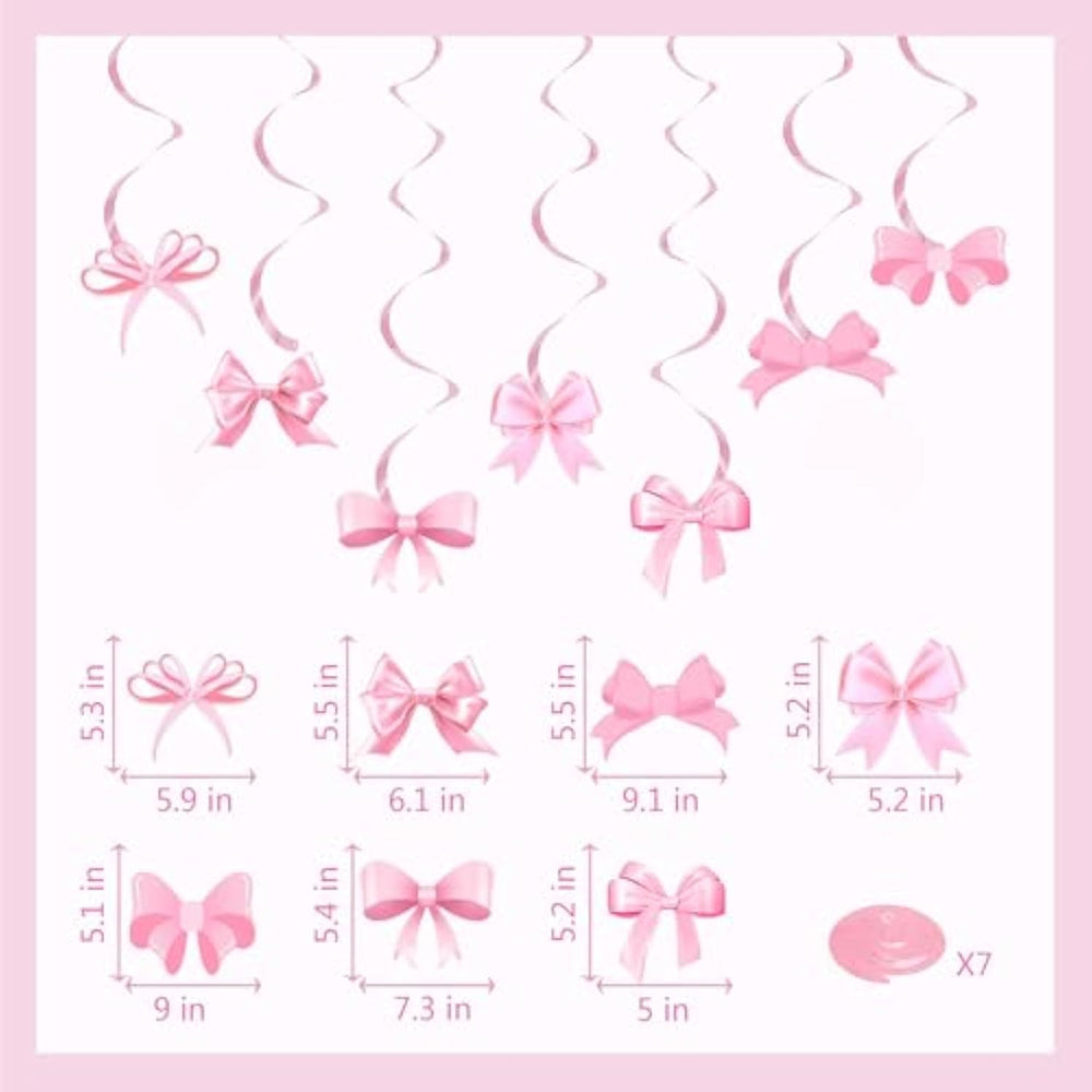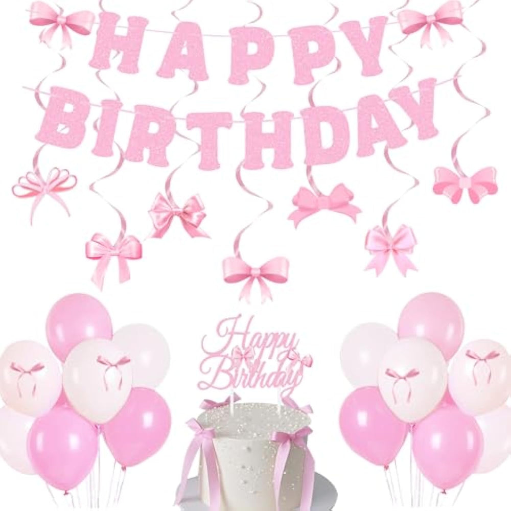 This pink bow party decoration set includes a Happy Birthday banner seven pink bow hanging swirls ten pink balloons and ten white balloons made of sturdy cardstock and latex materials ideal for various celebrations such as bow birthday parties baby showers bridal showers and more The decorations are easy to assemble and inflate making setup quick and hasslefree so you can focus on enjoying your special occasion.