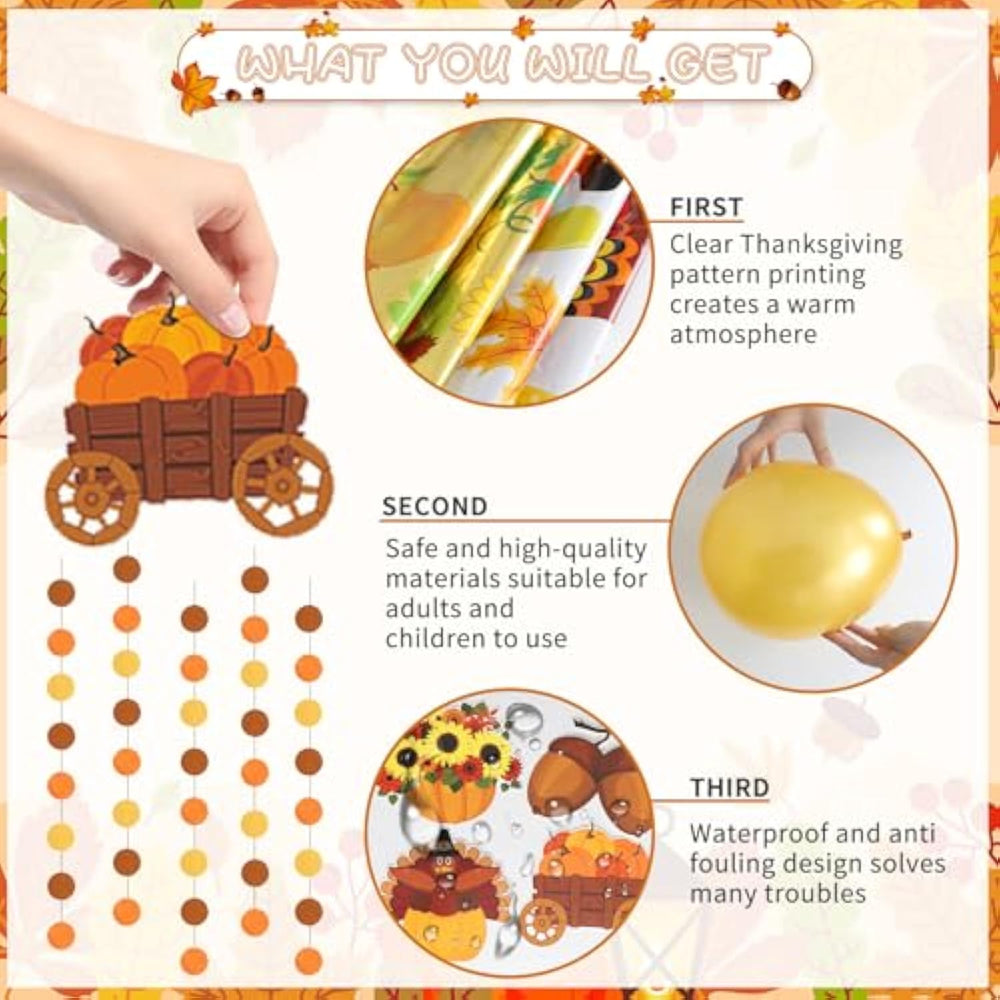 This Happy Thanksgiving Balloon Set includes 29 pieces of festive decorations, featuring 18 latex balloons in gold, orange, and coffee colors, along with themed foil balloons such as pumpkin, turkey, maple leaf, pine cone, and leaf designs. It also comes with a 16-inch gold “HAPPY THANKSGIVING” letter balloon banner, a round banner, and a Thanksgiving banner—perfect for Friendsgiving dinners and holiday parties. Made from premium natural latex and durable foil materials, these balloons are safe, eco-friendly, and built to last. The set showcases classic Thanksgiving elements like pumpkins, turkeys, and maple leaves, creating a warm and festive holiday vibe. Easy to assemble with included tools, this all-in-one kit is ideal for family gatherings, school events, performances, or any Thanksgiving celebration, instantly transforming any space into a cozy, autumn-themed party atmosphere.