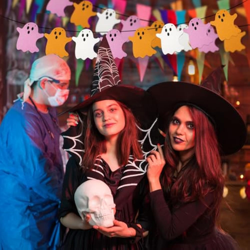 This Halloween set includes 2 hanging ghost banners, each measuring 3 m (9.8 ft) in total length, with individual ghosts sized 13.5 × 15 cm (5.3 × 5.9 in), perfect for adding a festive Halloween touch. Made from lightweight, durable glitter cardstock in pink, white, and yellow, the banners are long-lasting and easy to hang. The charming ghost shapes bring a playful yet spooky vibe, ideal for decorating mantels, door frames, walls, or any space to create a fun Halloween atmosphere.