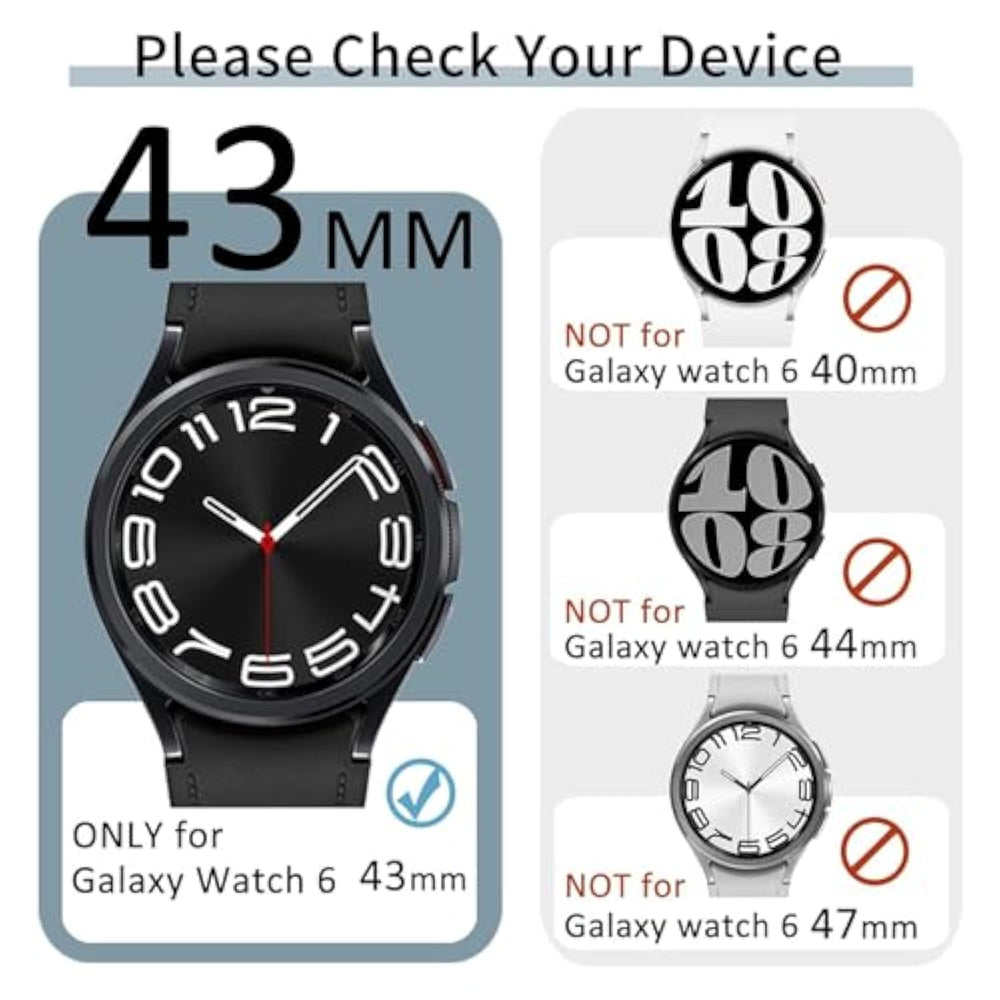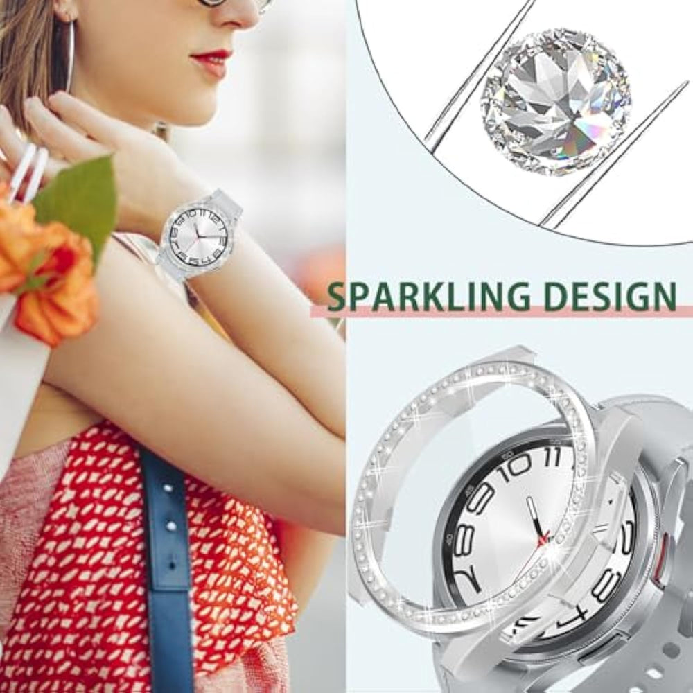 | ?Compatibility? Only Fit For Samsung Galaxy Watch 6 Classic 43 Mm (Sm-R950) .Please Carefully Select The Correct Size 43Mm Before Ordering. | | ?Exquisite Diamond Design? This Watch Case With Single Row Sparkly Diamonds, Gems Set Firmly, Adding Elegance And Charm To You. | | ?Full Protection 3-In-1 Combination Accessories? Galaxy Watch 6 Classic 43Mm Protective Cover Set Contains : Bumper + Tempered Glass Screen Protector + Glitter Bezel Ring. Protects Watch Body And Edges From Bumps And Damage, Scratches-Resistant, Anti-Fingerprint, Shockproof. | | ?Supports Charging? This Samsung Watch 6 Classic Case 43Mm Built-In Hardness Tempered Glass Screen Protector, Has High Touch Sensitivity Up To 99%, With Precise Cutout, High Touch Screen Sensitivity, Easy Access To All Controls,Provides A Better Using Experience. Supports Instant Charging. | | ?Includes?1 Set Galaxy Watch Classic 6 43 Mm Protector, And Cleaning Tools. | |