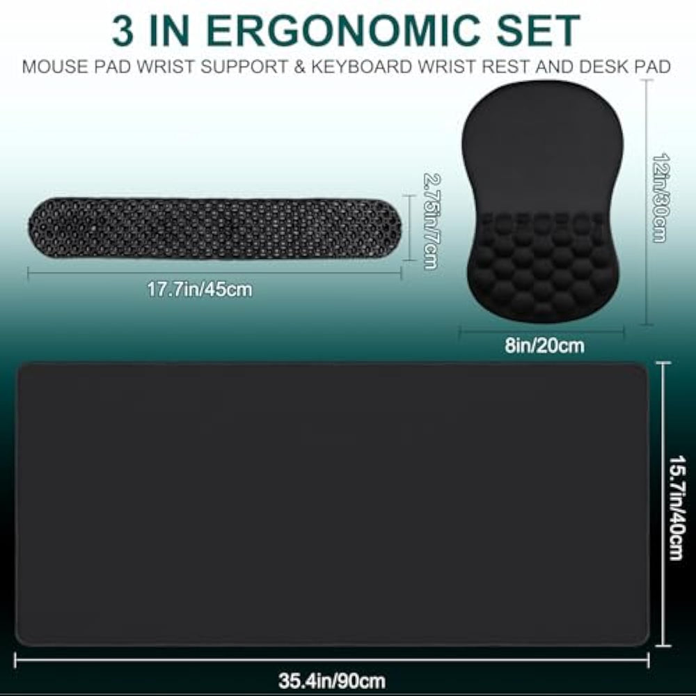 | 3 In 1 Set?Experience Unparalleled Comfort And Support With Our 3-In-1 Set That Includes An Ergonomic Wrist Rest For Computer Keyboard(17.7X2.75 Inch, 450X70X23Mm)?Wrist Rest For Mouse (12X8Inch, 300X200Mm) And Desk Pad(35.4X15.7Inch,900X400X3Mm). The Xl Desk Pad Offers A Spacious Area For Your Keyboards And Mouse, While The Gel Mouse Pad With Wrist Support Alleviates Pain From Prolonged Typing And Mouse Use | | Ergonomic Massage Design?Designed With Breathable Materials, Our Gel Mouse Wrist Rest Is Both Light And Durable. The Soft Cushioning Offers Excellent Massage For Your Wrist, Promoting Circulation And Reducing Discomfort. Suitable For Extended Periods Of Typing, This Small, Yet Comprehensive Set Enhances Productivity And Comfort | | Honeycomb Wrist Rest For Keyboard:The 0.9-Inch High Wrist Rest Is Combined With The Keyboard To Improve Typing Angle, Which Is Ergonomic And Avoids Joint And Wrist Fatigue, Relieving Pressure On The Elbows And Shoulders During Prolonged Use Of The Computer.The Keyboard Pad With Wrist Support Is Made Of Tpe Polymer Material, Delicate And Flexible, And Can Be Washed Repeatedly For A Long Time | | Ultra-Smooth Surface:Smooth, Wear-Resistant, Non-Balling, Comfortable To Touch, Accurate Positioning When Moving Quickly, Suitable For Wireless Mice, Optical Mice, Laser Mice And Other Types Of Mice | | Non-Slip Base Stitched Edges?The Base Is Made Of Pu Material, Which Can Be Firmly Adsorbed On The Desktop Like A Gel To Ensure The Smooth Use Of The Mouse. Delicate Stitched Edges Prevent Wear And Tear, Deformation And Deglossing During Prolonged Use. Enhance The Aesthetics And Service Life Of The Desk Pad | |