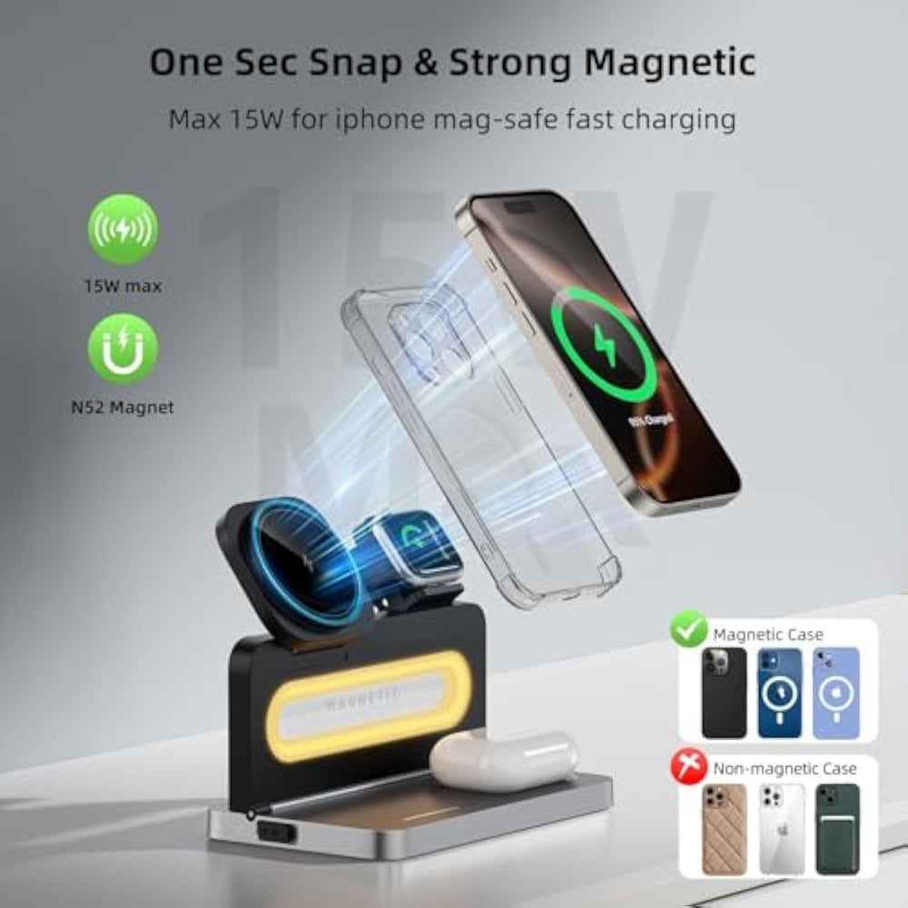 | 4 In 1 Magnetic Wireless Charging Station: 3 In 1 Wireless Charger For Magsafe Charging Station Makes Fast Charging Safe And Easy. The Built-In Super Strong Magnet Makes Alignment Instantly And Precisely, Just 1 Second To Achieve Lightning Fast Wireless Charging, Bringing You A Fast And Stable Wireless Charging Experience.The Magnetic Wireless Charger Stand Support Three Devices To Charge Simultaneously. Put Your Phone Onto The Device Horizontally Or Verti