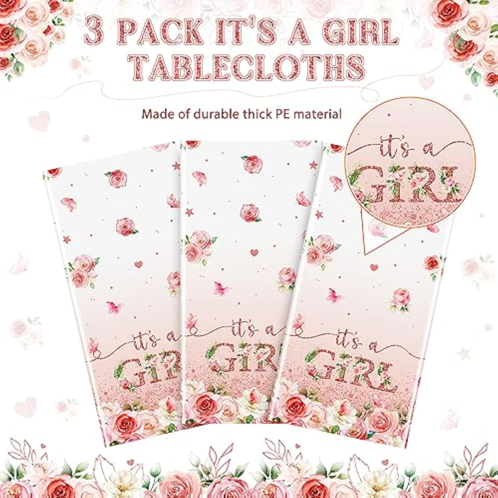 This baby girl floral tablecloth set includes 3 table covers measuring 54 x 108 inches, perfect for most 8 to 10 seat rectangular dining tables and ideal for creating a warm and inviting baby shower setup. Designed in soft pink with blooming flowers, butterflies, green leaves, and shimmering lettering, these tablecloths add a sweet and elegant touch to your celebration. Made from high-quality plastic, they are non-toxic, waterproof, scratch-resistant, and durable, providing excellent protection against spills and stains. Easy to clean up after the event, simply dispose of them to save time and focus on enjoying your special moments.