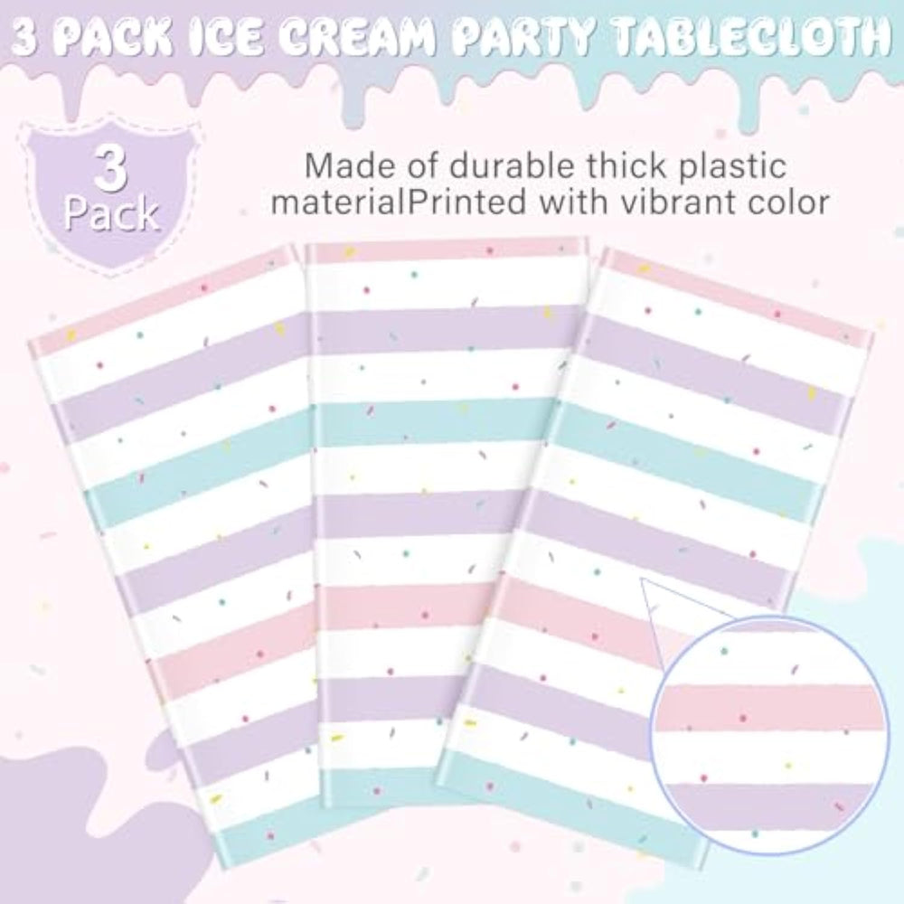 This set includes three ice cream sprinkle tablecloths featuring bright colors and a fun rainbow sprinkle design that creates a sweet and festive atmosphere. The classic design incorporates vibrant shades of purple, green, pink, and yellow, adding a lively touch to any celebration. Each tablecloth measures 54 by 108 inches, making them perfect for most rectangular tables seating 8 to 10 people, ensuring a comfortable and enjoyable party setting. Made from high-quality non-toxic plastic, these table covers are durable, scratch-resistant, and waterproof, effectively protecting against spills and stains while making cleanup quick and easy.