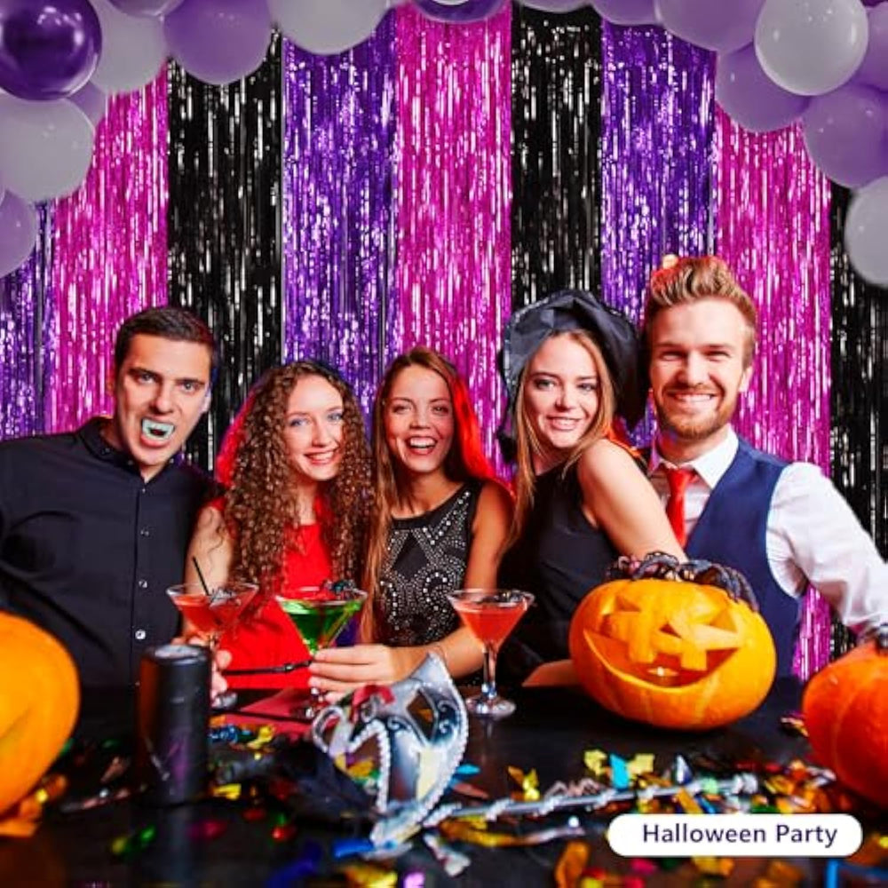 This set includes 3 packs of foil fringe party streamers, each measuring 3.28 x 6.56 ft, perfect for adding sparkle and charm to any celebration. Made from high-quality metallic foil material, these backdrops are durable, shiny, and easy to customize—simply cut to your desired length or width. Each curtain comes with an adhesive strip on the back for quick installation on walls, doors, or windows, making setup hassle-free. Ideal for decorating birthdays, stage backgrounds, Halloween parties, festivals, and more, these metallic streamers instantly elevate your party atmosphere with a fun and festive look.