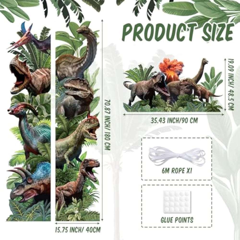 | Dinosaur Birthday Decorations: You'Ll Get A Set Of 3 Dinosaur Door Banners, 19.7Ft/6M Ropes And 1 Sheet Of Glue Points; These Eye-Catching And Lifelike Dinosaur Birthday Decorations Are Ideal For Front Door, Porch, Or Party Entrance, Making A Dramatic Statement For Your Dino-Themed Celebration | | Dinosaur Theme Design: This Dinosaur Door Banner Is Designed With Three-Dimensional Realistic Dinosaur Images And Bush Forest Backgrounds; Dinosaurs In Various Forms, Sharp Teeth And A Wide-Open Mouth Make You Feel Like Encountering A Dinosaur In The Forest, Adding Fun To Any Event | | Material And Size: Our Dinosaur Porch Banner Is Made Of Polyester Fabric, Sturdy And Not Easy To Fade Or Tear, Washable And Reliable; The Banner Height Is About 5.91 Ft/ 1.8 M And Width Is About 35.43 Inch/90 Cm; The Large Dino Photography Backdrop Is Lightweight Washable And Foldable, Allowing For Easy Carrying | | Easy To Use: The Dinosaur Birthday Backdrop Is Designed With Holes, Coming With Sufficient Ropes; Put The String Through The Holes Of The Dino Photo Booth Props Door Banner And Hang Directly, Saving Your Decoration Time; Play Your Imagination To Assemble And Enjoy Diy Fun With Your Family | | Wide Applications: The Dinosaur Photo Background Backdrop Is Suitable For Dinosaur Birthday Parties, School Parties, Community Events, Haunted House, Halloween Party, Spooky Parties; Whether You'Re Decorating Garage Door, Wall, Front Door, Photo Booth Backdrop Or As A Backdrop Inside The Party | |