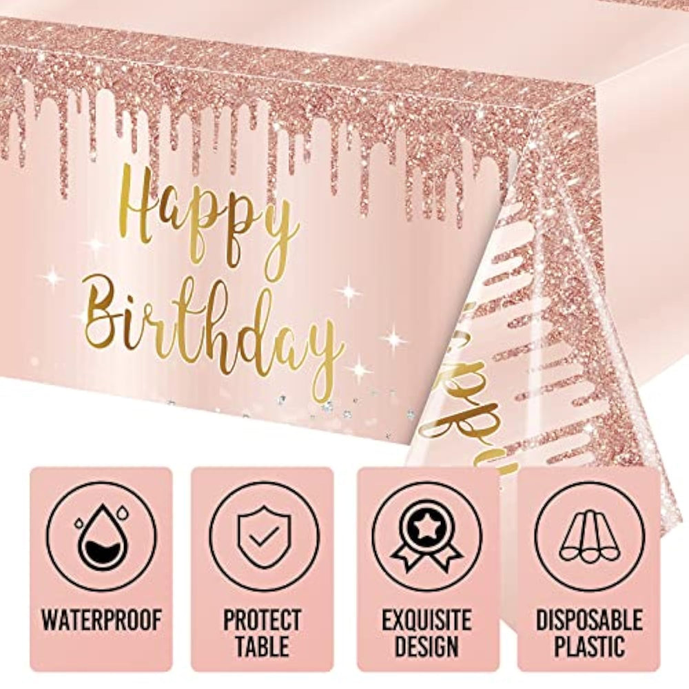 [You Will Get] - 3Pcs Pink Rose Gold Happy Birthday Tablecloth Decorations For Women Girls. 54 X 108 Inches, Suitable To Cover Most Rectangular Table Tops. [Note: Please Measure Table Size Before Purchase] | [Unique Design] - A Birthday Rectangular Tablecloth Designed Specifi