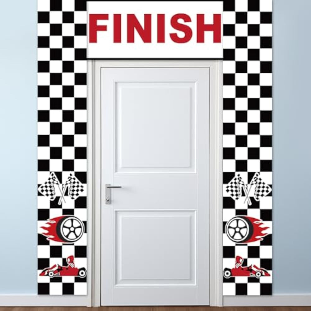 | Package Includes: Get Ready To Race With This 3 Piece Racing Car Birthday Porch Sign Set. Includes 1 Top Banner (39.4 X 15.7 Inches), 2 Door Banners (70.9 X 11.8 Inches), And A Long Rope For Easy Hanging. Ideal For A Racing Party Backdrop Banner Or Race Car Themed Photo Booth Props To Elevate Your Event. | | Racing Car Design: Featuring A Bold Black And White Checkered Flag Pattern With Striking Red Accents, The Racing Car Happy Birthday Door Decorations Include Race Flags, Tires, A Racer, And “Finish” Text For An