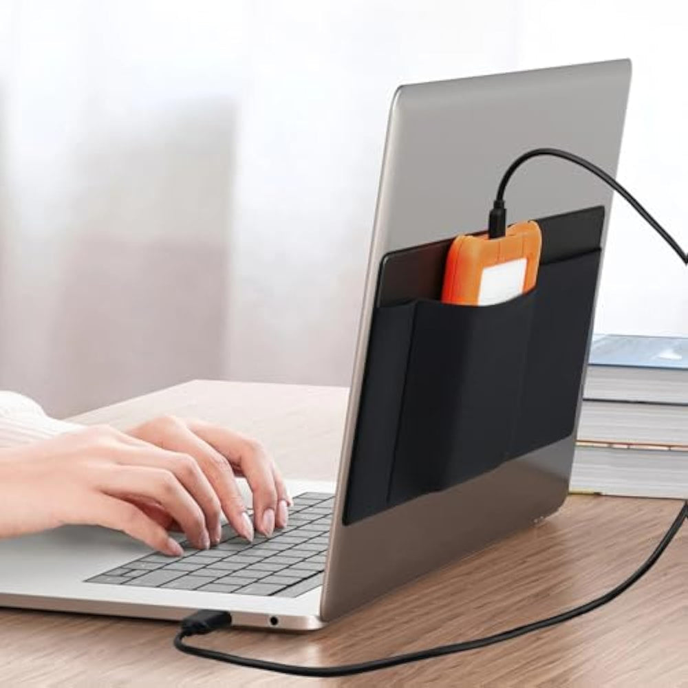 | 3-Pocket Stick On Pouch Organizer For Laptop: Three Pockets Design For More Storage, This Hard Drive Holder For Laptop Suitable For Most Universal Laptop Accessories. Whether You’Re Toting Around Portable External Hdds, Ssds, Wireless Mice, Or Compact Items Like Cables, Airtag, Earbuds, Chargers And More, This Adhesive Pouch Holder For Laptop Has Got You Covered, Ensures Your Macbook’S Companion Stays Secure And Accessible During Your On-The-Go Adventures. | | Reusable Traceless Strong Sticky Adhesive: We Use The High Quality 3M Reusable Residue-Free Adhesive Backing Which Sticks Firmly To The Surface Of The Laptop, Will Not Easily Fall Off, And Won’T Leave Annoying Glue Residue, Rest Assured That Keep Your Laptop Clean And Secure. At The Same Time, You Can Effortlessly Take Down And Re-Attach The Laptop Mouse Holder Until You Find A Spot That Works For You. | | Keep Your Hard Drive And Mouse At Your Finger Tips: This Ssd Laptop Holder Can Be Attached To Your Laptop, Macbook, Ipad, Morphing External Storage Into An Extension Of Your Laptop, You Can Put Your Portable Hard Drive Ssd, Usb Hubs, Charging Cables, Card Reader, Wireless Mouse, Airpod Or Any Other Essentials In This Laptop Adhesive Pocket Of The Laptop. After That, You No Longer Have To Rummage Through Your Bag To Find Your Electronic Accessories. | | Stick-On Laptop Organizer Adhesive Mouse Pouch: The Hard Drive Holder Sleeve For Laptop Is Incredibly Thin And Lightweight, A Perfect Storage Way For Users Who Prioritize Portability Without Adding Extra Bulk To Their Beloved Macbook. Flexible Elasticity And Rebound Allows Various Device Whether It'S Thin Or Thick, The Mouse Holder For Laptop Will Hold The Your External Hard Drive, External Ssd, Magic Mouse And Phone Securely In Place, Not Easy Slip Out. Dimensions-10.7'' X 5.5'' X 0.16'' | | Portable Extra Storage For Daily Essentials: Just Open The Package, Clean The Surface Of The Laptop Or Tablet And Stick On Ssd Hard Drive Holder For Laptop. Please Note That Too Frequently Removing And Re-Attaching The 3-Pocket Organizer Stick On Laptop Pouch May Weaken The Adhesive. | |