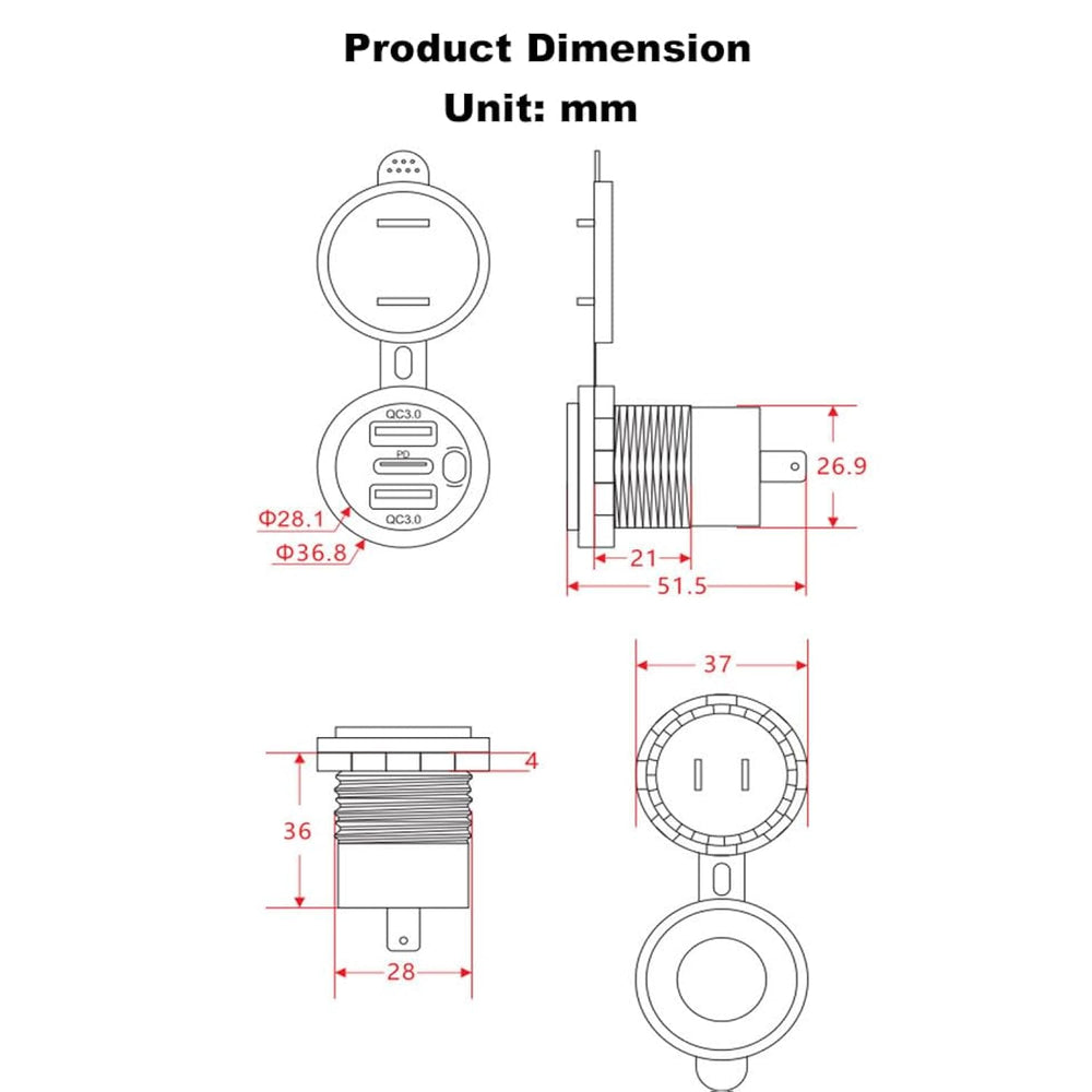 | The 3 Ports Usb(1 Pd + 2 Qc) Car Charger Can Charge Three Devices At The Same Time, And The Multi-Port Design Helps You Meet Your Needs. The Built-In Smart Chip Enables Each Port To Intelligently Recognize Your Device And Maximize Charging Speed. Built-In Protection Against Overcurrent, Overheating And Overcharging. | | Energy Saving Switch, Soft Ambient Light. Push Button Switches Control All Charging Usb Ports, Ensuring That The Charger Does Not Continue To Drain Your Car Battery When Idle, Saving Energy. The Soft Ambient Light Is Easy To Check If The Connection Is Successful And Easy To Operate In Dark Environments. | | Fast Charging, The Maximum Output Power Is 30W(Pd). Input Voltage 12/24V, Output Voltage 5V, Output Current 3.1A. Qc3.0 Usb Interface Provides 4 Times Faster Charging Speed For Compatible Devices, Allowing Them To Reach 80% Charge In 35 Minutes. (Note: When Multiple Usb Ports Are Charged At The Same Time, Pd Port Is Fast Charging, 2 Qc Are Ordinary Charging, And The Ports Are Fast Charging When Used Alone, 5V-3A/8V-2A/12V-1.5A.) | | Wide Compatibility. Suitable For Car, Boat, Marine, Motorcycle, Atv, Rv And Other Instrument Panel Or Cigarette Lighter Modification. Support A Variety Of Mobile Phones, Tablets, Digital Cameras, Recorders, Charging Banks, Video Game Controllers, Sports Watches And Other Devices. | | Waterproof And Dust-Proof Charger. Pc Material, Fire, Corrosion, Durable. A Power Cord Is Included In The Package. Wiring Instructions: "+" Connects To The Positive Terminal Of The Power Supply, "-" Connects To The Negative Terminal Of The Power Supply. | |