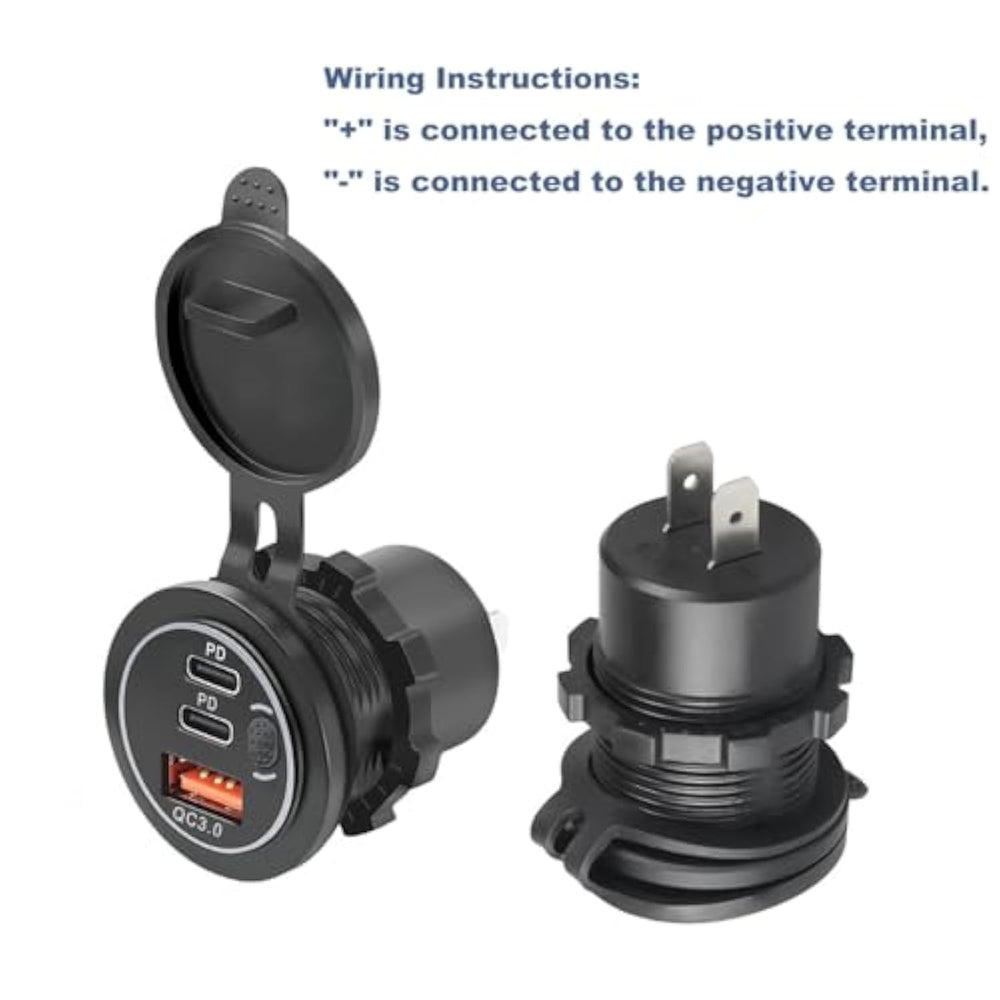 | The 3 Ports Usb(2 Pd + 1 Qc) Car Charger Can Charge Three Devices At The Same Time, And The Multi-Port Design Helps You Meet Your Needs. The Built-In Smart Chip Enables Each Port To Intelligently Recognize Your Device And Maximize Charging Speed. Built-In Protection Against Overcurrent, Overheating And Overcharging. | | Energy Saving Switch, Soft Ambient Light. Push Button Switches Control All Charging Usb Ports, Ensuring That The Charger Does Not Continue To Drain Your Car Battery When Idle, Saving Energy. The Soft Ambient Light Is Easy To Check If The Connection Is Successful And Easy To Operate In Dark Environments. | | Fast Charging, The Maximum Output Power Is 30W. Input Voltage 12/24V, Output Voltage 5V, Output Current 3.1A. Qc3.0 Usb Interface Provides 4 Times Faster Charging Speed For Compatible Devices, Allowing Them To Reach 80% Charge In 35 Minutes. (Note: When Multiple Usb Ports Are Charged At The Same Time, A Pd Port Is Fast Charging, 1 Pd+1 Qc Are Ordinary Charging, And The Ports Are Fast Charging When Used Alone, 5V-3A/8V-2A/12V-1.5A.) | | Wide Compatibility. Suitable For Car, Boat, Marine, Motorcycle, Atv, Rv And Other Instrument Panel Or Cigarette Lighter Modification. Support A Variety Of Mobile Phones, Tablets, Digital Cameras, Recorders, Charging Banks, Video Game Controllers, Sports Watches And Other Devices. | | Waterproof And Dust-Proof Charger. Pc Material, Fire, Corrosion, Durable. A Power Cord Is Included In The Package. Wiring Instructions: "+" Connects To The Positive Terminal Of The Power Supply, "-" Connects To The Negative Terminal Of The Power Supply. | |