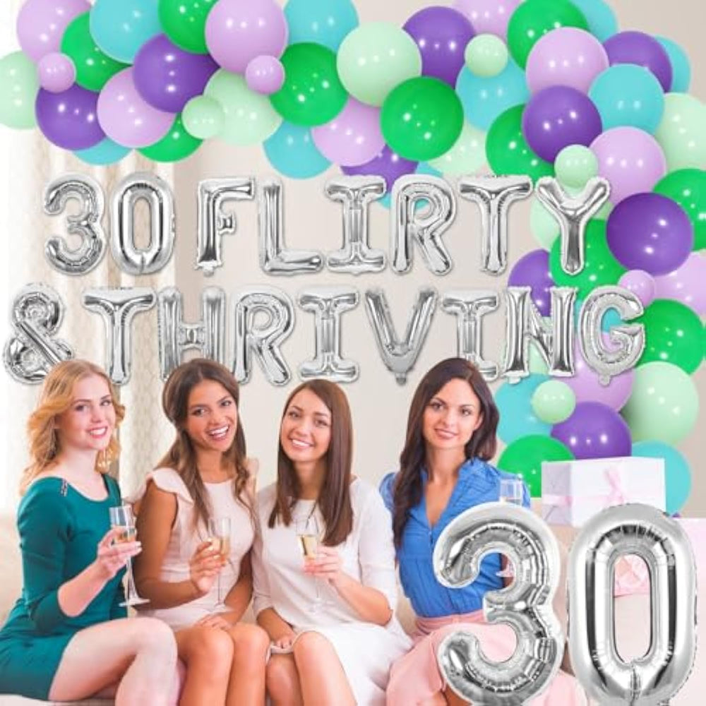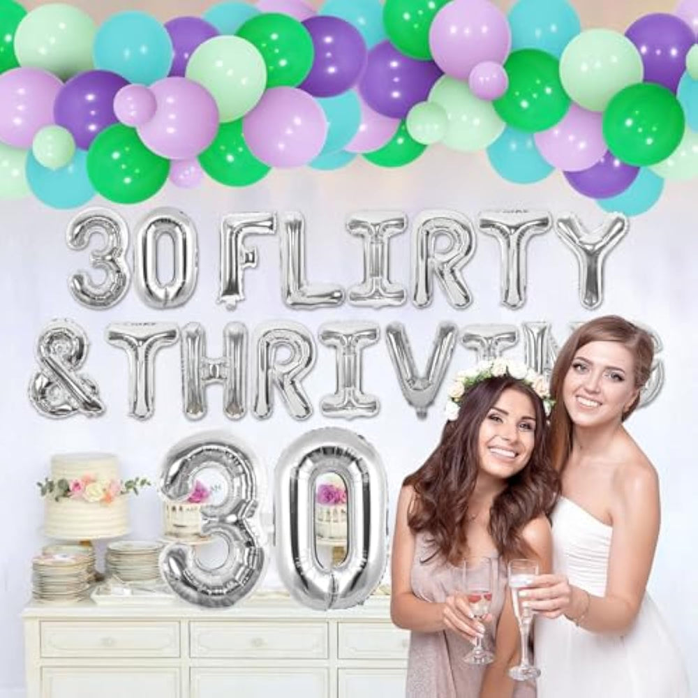| Package Includes: Choose Our 30 Flirty And Thriving Party Decorations For Your 30Th Birthday. We Prepare All Party Supplies You Need. There Have 1 X 30 Flirty And Thriving Foil Balloon 16 Inch, 50 X 12 Inch Balloons(10*Macaron Green, 10* Macaron Purple, 10*Blue, 10*Green, 10*Purple), 10 X 5 Inch Balloon(5*Macaron Green, 5*Macaron Purple), 2 X Silver One-Piece Star 22 Inch And 1 X Silver Number 30 Foil Balloon 32 Inch. | | One-Stop 30Th Party Decoration: Our 30 Flirty And Thriving Themed Birthday Party Decoration Have Enough Thirty Birthday Party Elements You Can Image. Use Our Balloon Kit To Celebrate Your Impressive Moment! It Can Be The Dreaming And Fantastic 13 To 30 Birthday Party For You. | | Wonderful 30 Flirty And Thriving Birthday: These 30Th Birthday Balloons And Decorations Make The Wonderful Happy 30Th Birthday Decorations For Her, Creating A Festive Mood And The Ideal Decor For Capturing These Moments! This Is A Gorgeous Ending Of Your Life Before 30Th, Also A Bright Start For The Rest Life. | | Funny Setup Time: Decorating Your Birthday Party With Our 30Th Birthday Decorations For Her Balloon Kit. Making Balloon Arch Or Balloon Banner, You Can Enjoy This Unforgettable 30Th Birthday Party With Your Close Friends And Family Members. | | Warm Tips: We Prepare Inflating Balloon Tools For You In Our Surprise 30Th Birthday Party Decorations To Help Save Your Time, You Can Fix Balloons With The Offered Rape, String And Adhesive Dots. This Will Be Happy And Stress-Free 30 Flirty And Thriving Party Balloon Kit. | |