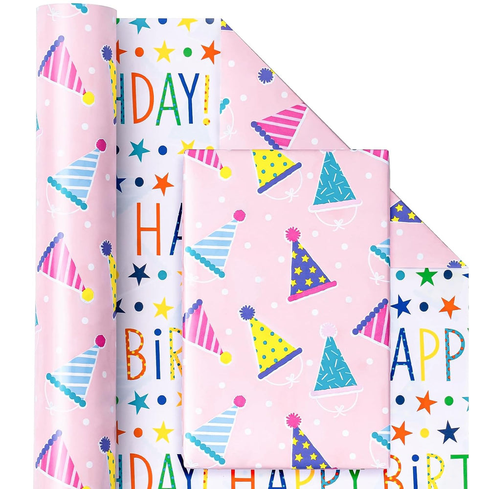 | Perfect Size: Each Roll Measures 30 Inch Wide X 33 Feet Long Reversible: Colourful Birthday Hat Printed On Pink Paper, Colorfule Birthday Lettering Are Printed On The Reverse, Two Different Designs Make Unique And Varied Gift Presentations Easy Premium Quality: Created With High-Quality Paper Materials, Thick And Not Easily Tear Or Rip, Item Came With Shrink Film To Prevent Wrapping Paper From Scratches And Reduce Dust Use All Occasion: Perfect For Girls Birthday, Kids Birthday, Baby Shower, Holiday, Party Gifts Wrap, It Is Also Great For Craft Project Quality
