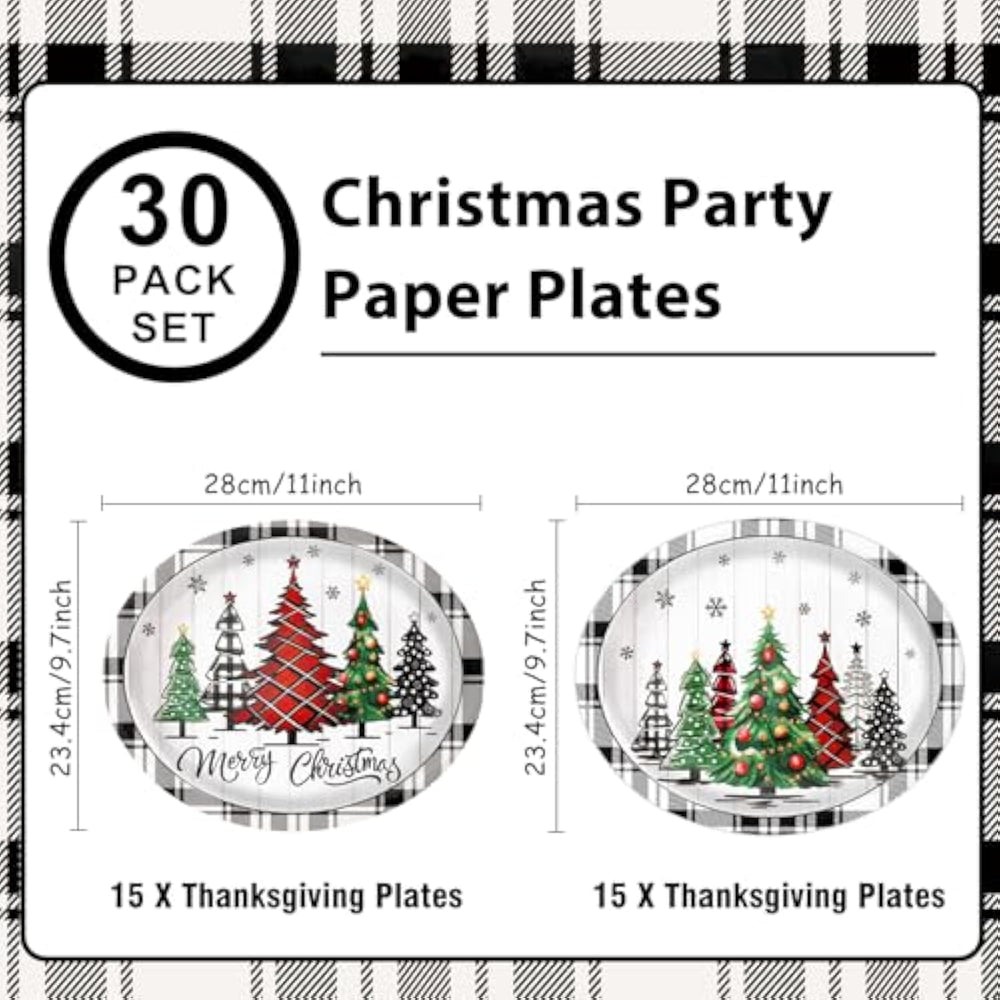| Christmas Disposable Plates: Includes 30 Plates In Two Festive Holiday Designs (15 Of Each), Featuring Vibrant Seasonal Artwork. The Generous Quantity And Eye-Catching Design Make Them Perfect For Daily Use Or Festive Gatherings, Sure To Leave A Lasting Impression On Your Guests | | Christmas Design: Christmas Disposable Plates Decorated With Multiple Christmas Trees In Red Buffalo Plaid, Black-And-White Checks, Green Polka Dots, And Classic Ornament Styles, Plus Snowflakes And A Bold “Merry Christmas” Greeting, Adding A Warm, Festive Touch To Your Table | | High-Quality Large Size: These Large 9 X 11-Inch Christmas Oval Paper Plates Are Crafted From Premium, Thick Paper That Is Soft To The Touch Yet Sturdy And Durable. Printed With Food-Grade, Water-Based Ink, They’Re Safe For Direct Food
