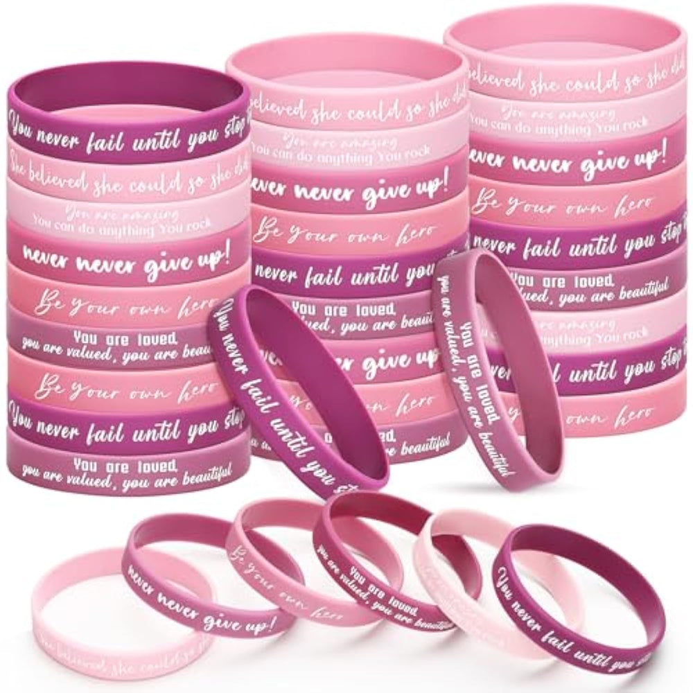 | Inspirational Bracelets: The Pink Stretch Wristbands Are Printed With Different Cheerful Words Like " Never Never Give Up" , " Be Your Own Hero" And So On, Wearing Them Can Add You More Charms, Show Your Attitude And Make You Look Cool And Chic | | Suitable Occasions: These Inspiring Silicone Bracelets Serve As Trendy Accessories In Pink Series For Everyday Wear, Make Them Eye-Catching And Full Of Cheerful Feeling, Suitable For Valentine'S Day, Birthday Party, Wedding, Family Gathering, Carnivals, Music Festive And Other Occasions | | Practical And Beautiful Gift: The Motivational Wristbands Are Suitable For Your Friends And Family Members As Birthday Gifts, Holiday Gifts, Graduation Gifts, Anniversary Gifts And More, Cheerful Messages Can Give People Encouragement And Power, Bright Colors Are Easy To Match With Different Clothes | | Material And Size: The Pink Stretch Bracelets Are Made Of Silicone Material, Soft And Comfortable To Wear, Measures About 2.17 Inches/ 5.5 Cm In Diameter, 0.47 Inch/ 12 Mm In Width, 7.95 Inches/ 202 Mm In Circumference And 0.08 Inch/ 2 Mm In Thickness; Proper Elasticity Makes Them Suitable For Most People And Convenient To Put On And Take Off | | Sufficient For Different Use: Our Package Includes 30 Inspirational Silicone Bracelets; The Bracelets Come In 6 Different Styles, With Each Style Being Represented By 5 Stylish Pieces; Sufficient Quantity For Your Daily Wearing And Replacement, Party, Competition, School Activity And Other Use | |