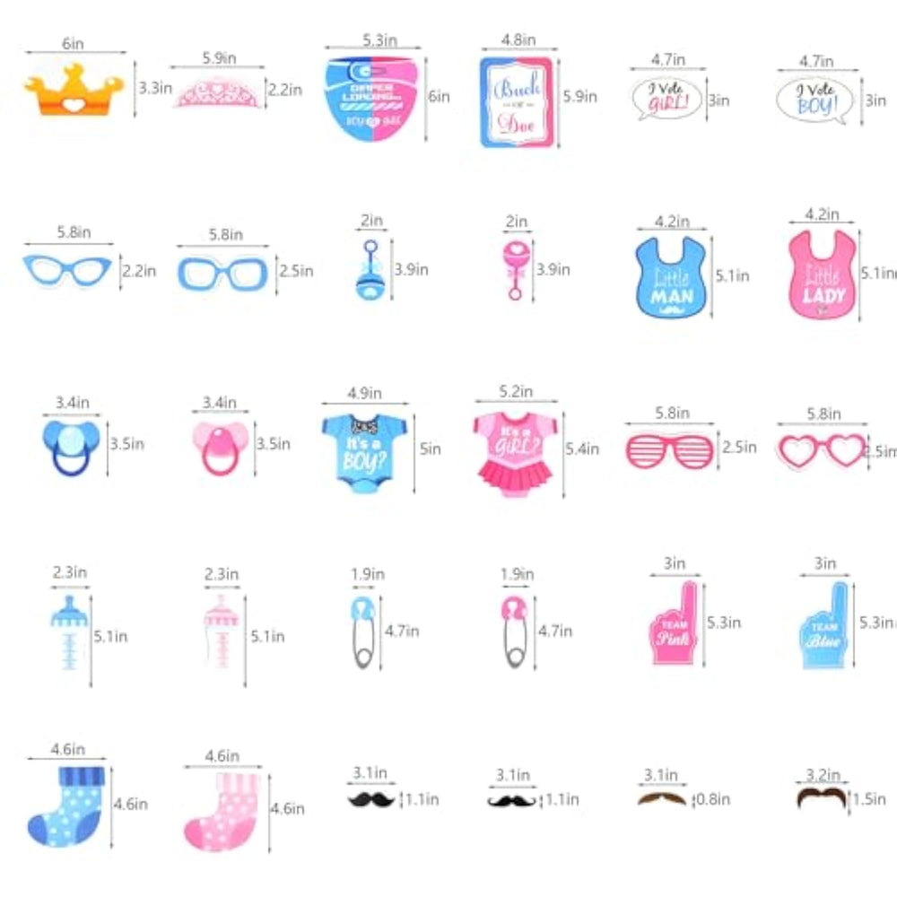 | Includes:Baby Gender Photo Booth Props Include 30 Styles Of Design, Which Have The Classic Theme Elements Of Gender Reveal, Including The Crown, Glasses, Baby Bottles, And Other Pattern | | Premium Material:Baby Gender Reveal Party Decorations Made Of High-Quality Paper Cardboard, Lightweight And Convenient, Clear Printing, Bright Colors, Provide Fun Photo Props And Poses For Your Photos, Also Can Bring Warm Decoration For Your Family For A Long Time. | | Easy To Use:Baby Shower Party Supplies Are Easy To Use, We Will Provide Double-Sided Adhesive Tape And A Pack Of Sticks, Just Choose Your Favorite Photo Elements, Children And Guests Can Easily Assemble A Personalized Photo Prop. | | Wide Application?Boy Or Girl Theme Party Decorations Can Not Only Be Used As Photo Props, But Also Made Into Desktop Accessories Center, Photo Props Decorated In A Vase, You Can Also Use Tape To Stick The Logo On The Wall, Window, Porch, To Bring Your Home Baby Gender Reveal Party Fun Time. | | Good Memories:With Lots Of Cartoon Pattern And Colorful Pictureswill Create Great Happiness And Memories For You And Your Kids, Which Allows You To Record Important Moments With Your Baby In A More Fun Way. | |