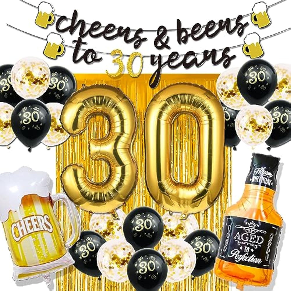 | Unforgettable 30Th Birthday Decorations: 30Th Birthday Decorations For Him Mean A Brand New Chapter To One'S Life And You Deserve A Special Way To Enter It.Just Throw A Remarkable 30Th Birthday Decorations With Our 30 Birthday Party Supplies And Enjoy Your Time With Friends Or Families At Such A Fancy Night | | What You Will Receive: 30Th Birthday Decorations For Him Included 1Pcs 40" Gold Balloons Of Number 30, 10Pcs 12" Gold Confetti Balloons, 10Pcs 12" Black Latex Balloons , 1Pcs Large Size Bottle Balloon, 1Pcs Mug Balloon, 1Pcs Gold Backdrop Fringe Curtain And 1Pcs "Cheers To 30 Years" Birthday Banner | | Decorate Your 30Th Party Sparkle: Creative Cheer To 30Th Birthday Banner And Balloons In Simple But Gorgeous Black Gold Theme Make Your Party Brilliant And Unparalleled. Put On These 30Th Birthday Gifts For Him On The Wall, Window, Garland Or Garden Which Appeals To Everyone | | Durable Designed: All Our 30 Birthday Decorations For Him Are Made Of Premium Latex Or Foil To Ensure Safety And Durability,Which Won'T Easily Burst Or Leak. These Cheers To 30 Years Banner And The Fringe Curtain Can Be Used For Years To Come Against Shedding Or Fading | |