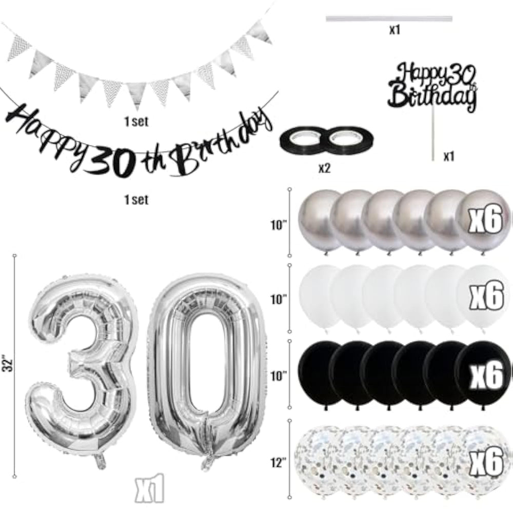 | ?? Black And Silver 30Th Birthday Decorations - You Will Get 1Pc Black Happy 30Th Birthday Banners, 1Pc Silver Triangle Flag Bunting Banners, 1Pc 30Th Birthday Cake Decorations, 2Pcs 32Inch Number 30 Foil Balloon, 6Pcs 10Inch Black Birthday Balloons, 6Pcs 10Inch White Party Balloons, 6Pcs 10Inch Metallic Silver Latex Balloons, 6Pcs 12Inch Silver Confetti Helium Balloons, 1Pc White Ribbon. | | ?? Premium Material - Our Happy 30Th Birthday Bunting Banner Is Made Of High-Quality Thick Cardboard, Durable. And The Women Men 30Th Birthday Balloons Are Made Of High-Quality Aluminum Foil And Durable Latex, Sturdy And Reusable. Supported With Air Or Helium, Which Will Stay Inflated For A Long Time, Safe To Be Used Around Kids. You Can Easily Inflate And Deflate These Birthday Party Balloons Decoration. | | ?? Value 30Th Birthday Party Decor Set - The Black White Silver Birthday Party Decorations Contains Everything You Want On The Her Or Him 30Th Birthday Party. Whether It'S A 30Th Anniversary Or A 30Th Birthday Party, Our 30Th Birthday Party Supplies Will Create A Festive Atmosphere And Make The Birthday Men Or Women Feel Special And The 30Th Birthday Bunting Banners Set Is Not Only Great For Photo Booth Backdrop, But Also Good For Other Memories Occasions. | | ?? Easy To Use - Black 30 Year Old Birthday Balloons Can Be Blown Up With Air Or Helium! The 30Th Birthday Gifts Foil Balloons Have Self-Sealing Valve Does Not Need To Be Knotted. And The Happy 30Th Birthday Banner Bunting Comes With Ribbon, Very Easy To Assemble And Hang. You Can Easily Prepare A Surprise And Unforgettable Birthday Party And Cheers To 30 Years. | | ??Attention - Due To The Thermal Expansion And Contraction Characteristics Of Aluminum Foil Balloons, Please Avoid Filling More Than 90% Of Air Or Helium. If The Ambient Temperature Is Too Low, It Will Also Cause The Balloon To Deflate. At This Point, You Can Inflate It Again. We Have Attached Pictures Of Operation Instructions. If There Is Anything You Don’T Understand, You Can